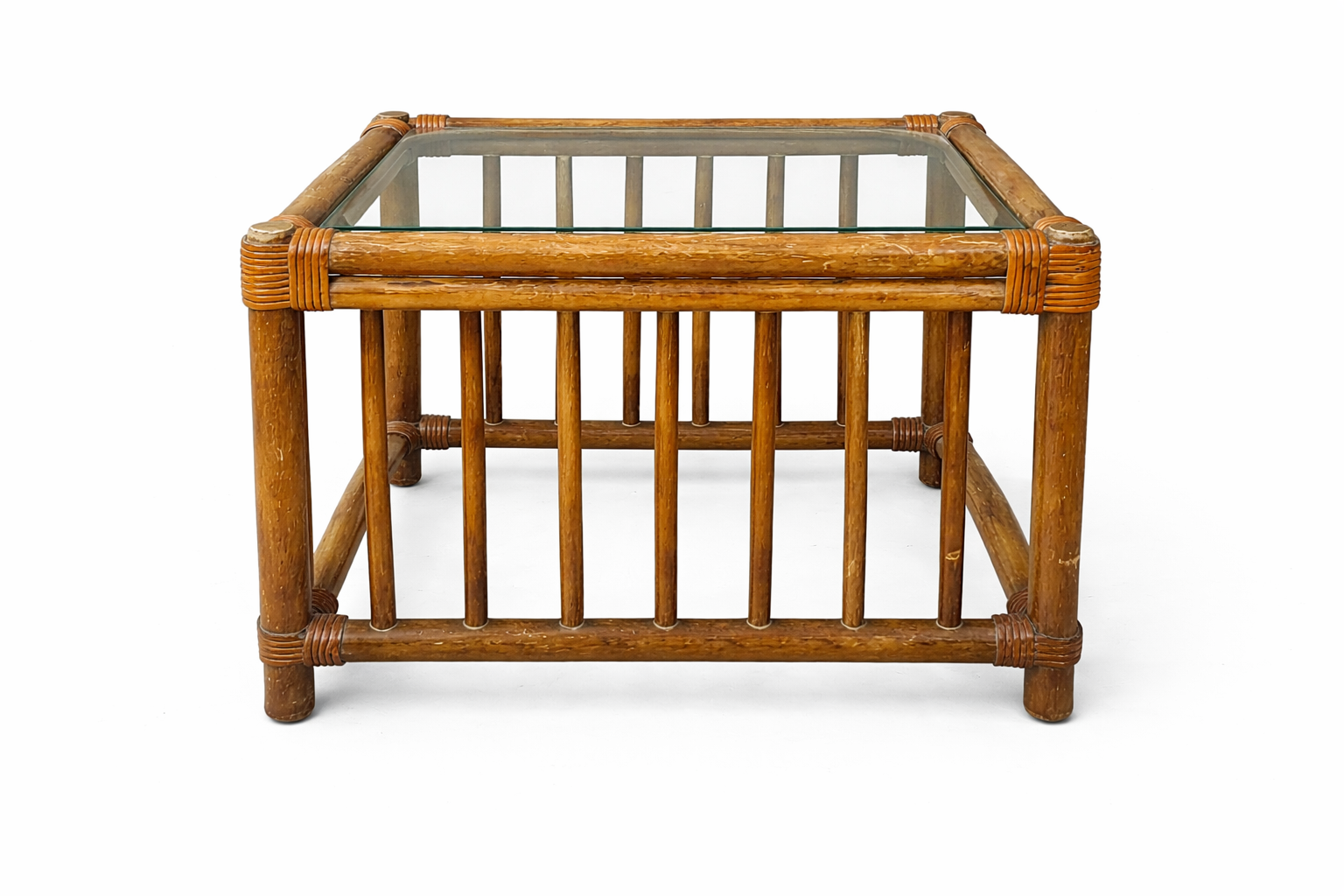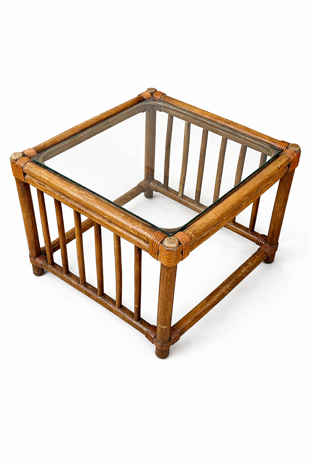 Mesa de apoio em madeira/bambu com tampo em vidro, de linhas simples e estilo vintage.