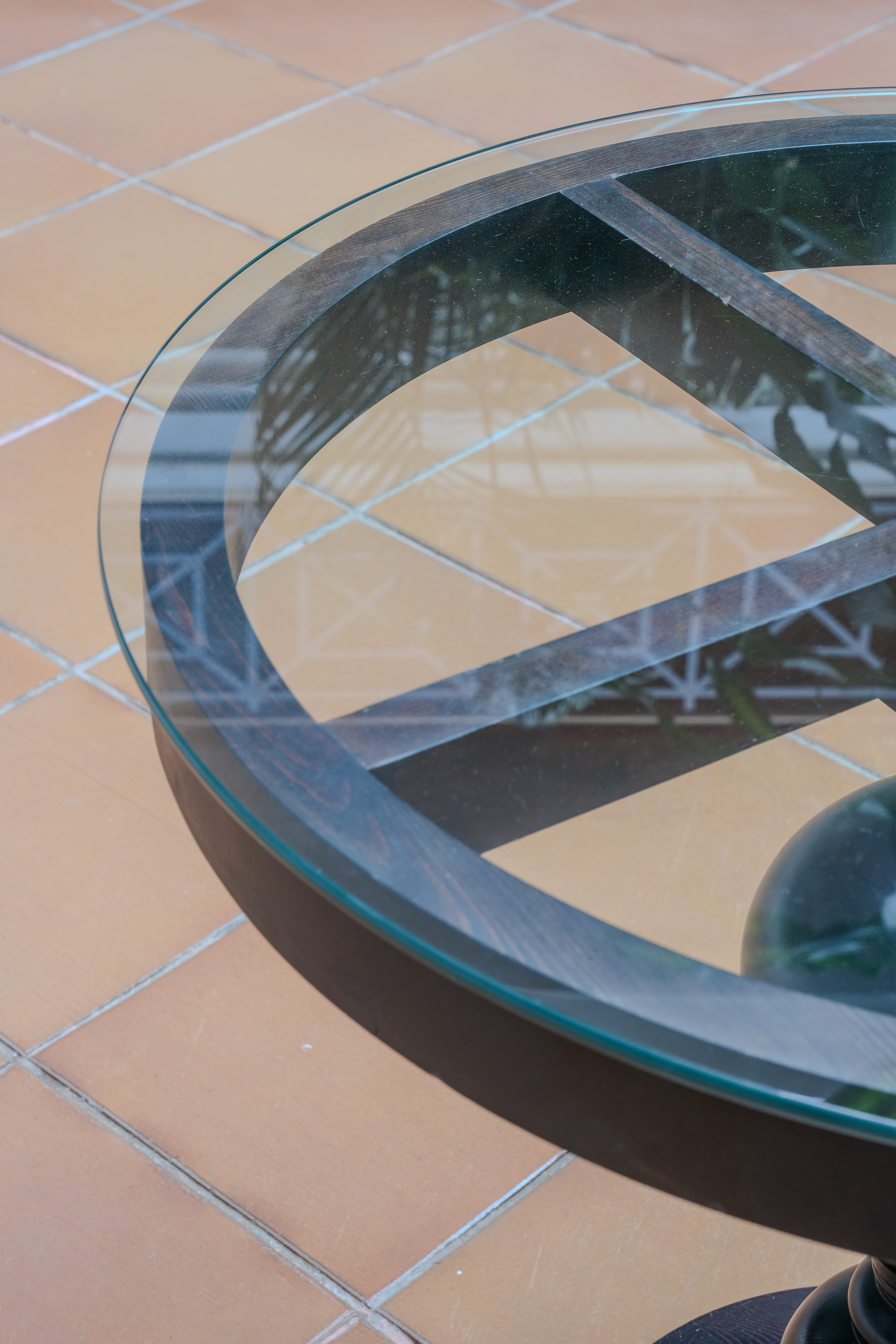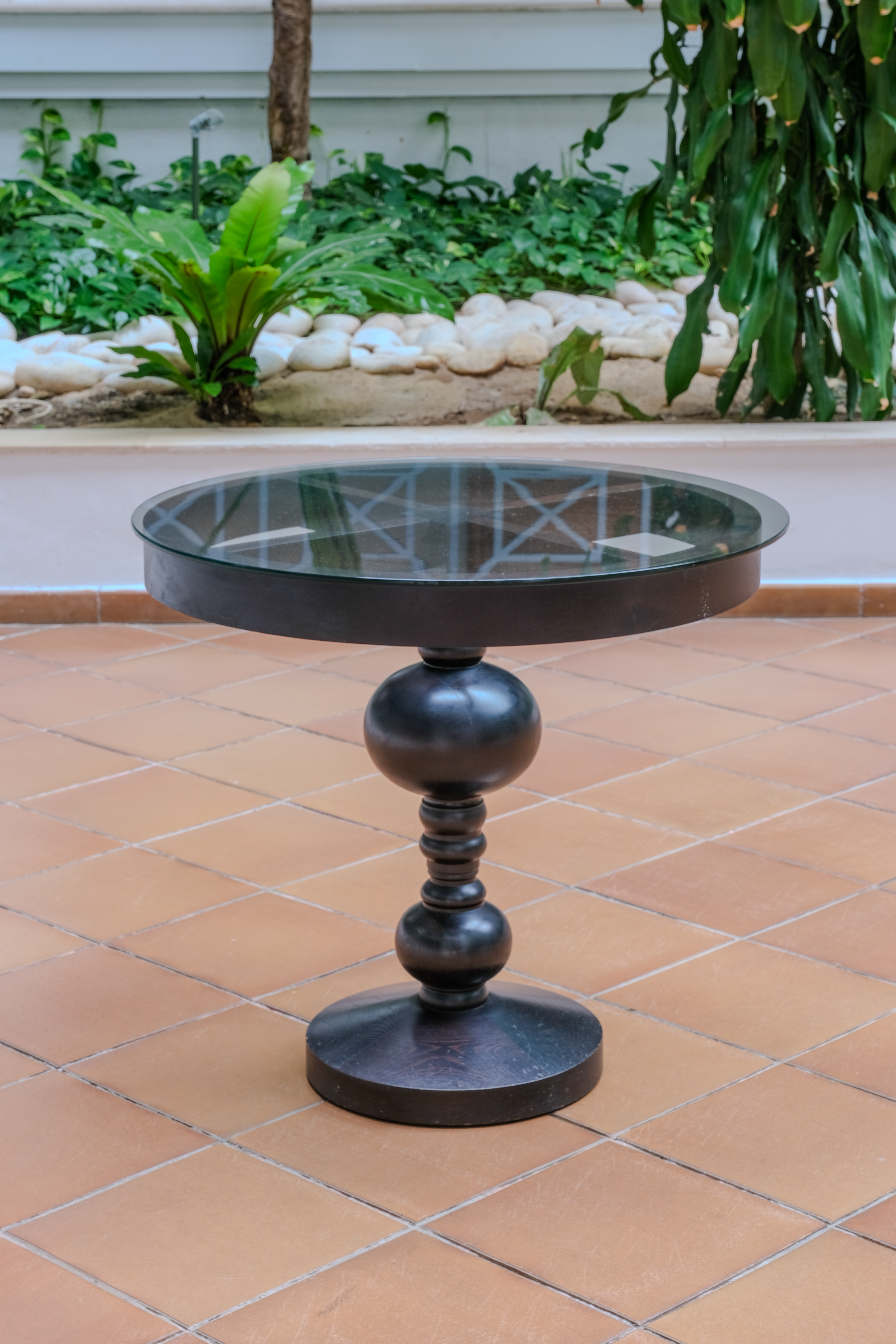 Mesa redonda de apoio com design clássico, composta por uma base em madeira escura torneada e um tampo em vidro transparente. A estrutura apresenta um pé central esculpido em formas esféricas e cilíndricas, conferindo elegância e caráter ao conjunto.