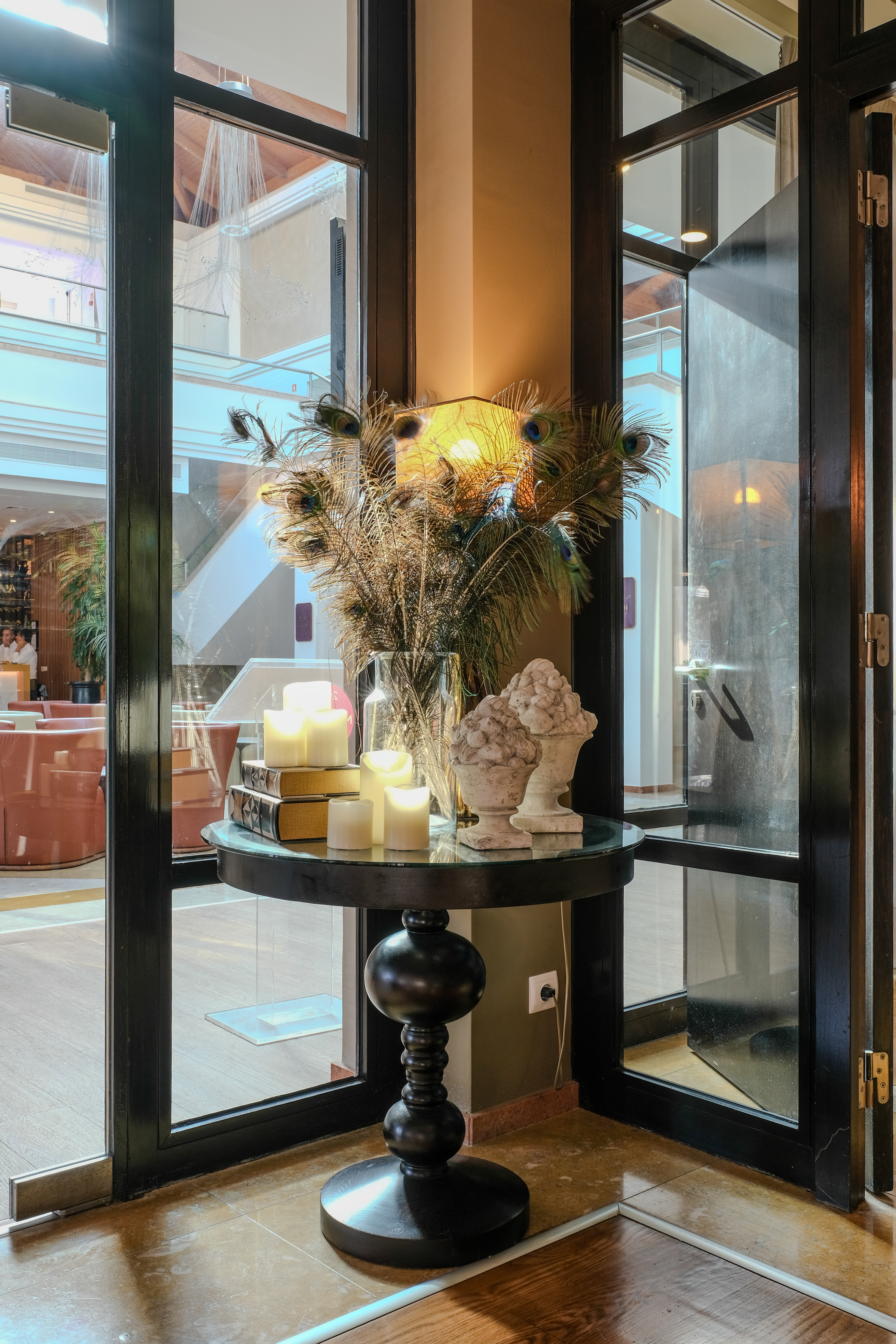 O tampo de vidro destaca a base trabalhada e torna a peça visualmente leve, ideal para ambientes de hotelaria, salas de estar, recepções ou zonas de lounge.