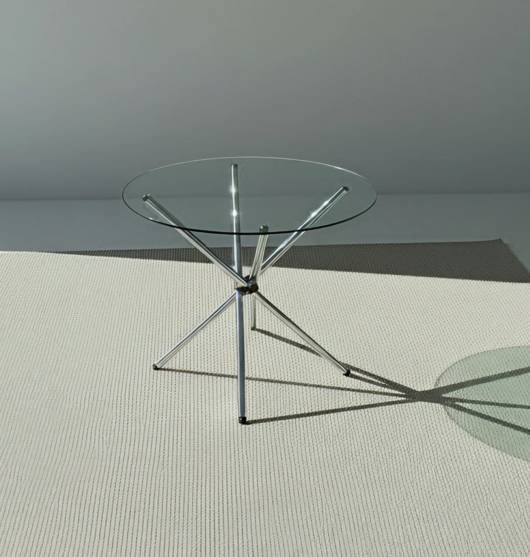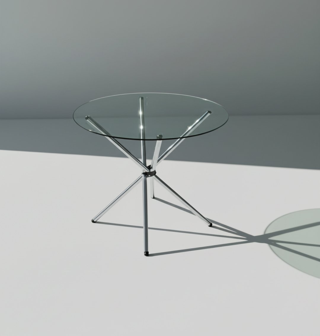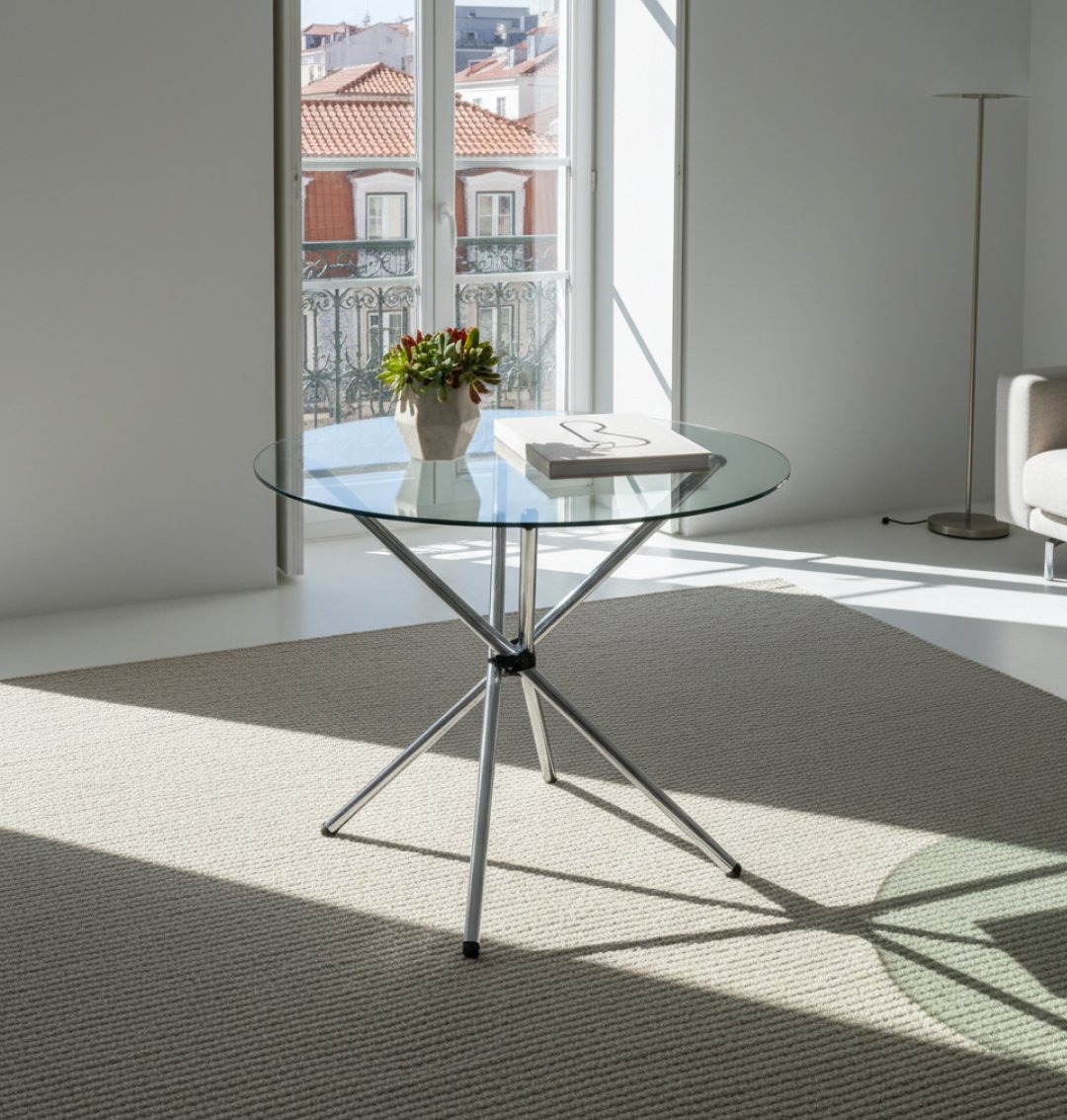 Esta mesa de apoio personifica o design minimalista e industrial. O tampo em vidro temperado transparente oferece uma leveza visual que não sobrecarrega o ambiente, enquanto a estrutura de suporte em aço cromado, com pernas cruzadas em forma de estrela, garante estabilidade e um toque moderno. É a peça perfeita para salas de estar contemporâneas, zonas de café ou escritórios que privilegiam a transparência e o brilho dos materiais metálicos.