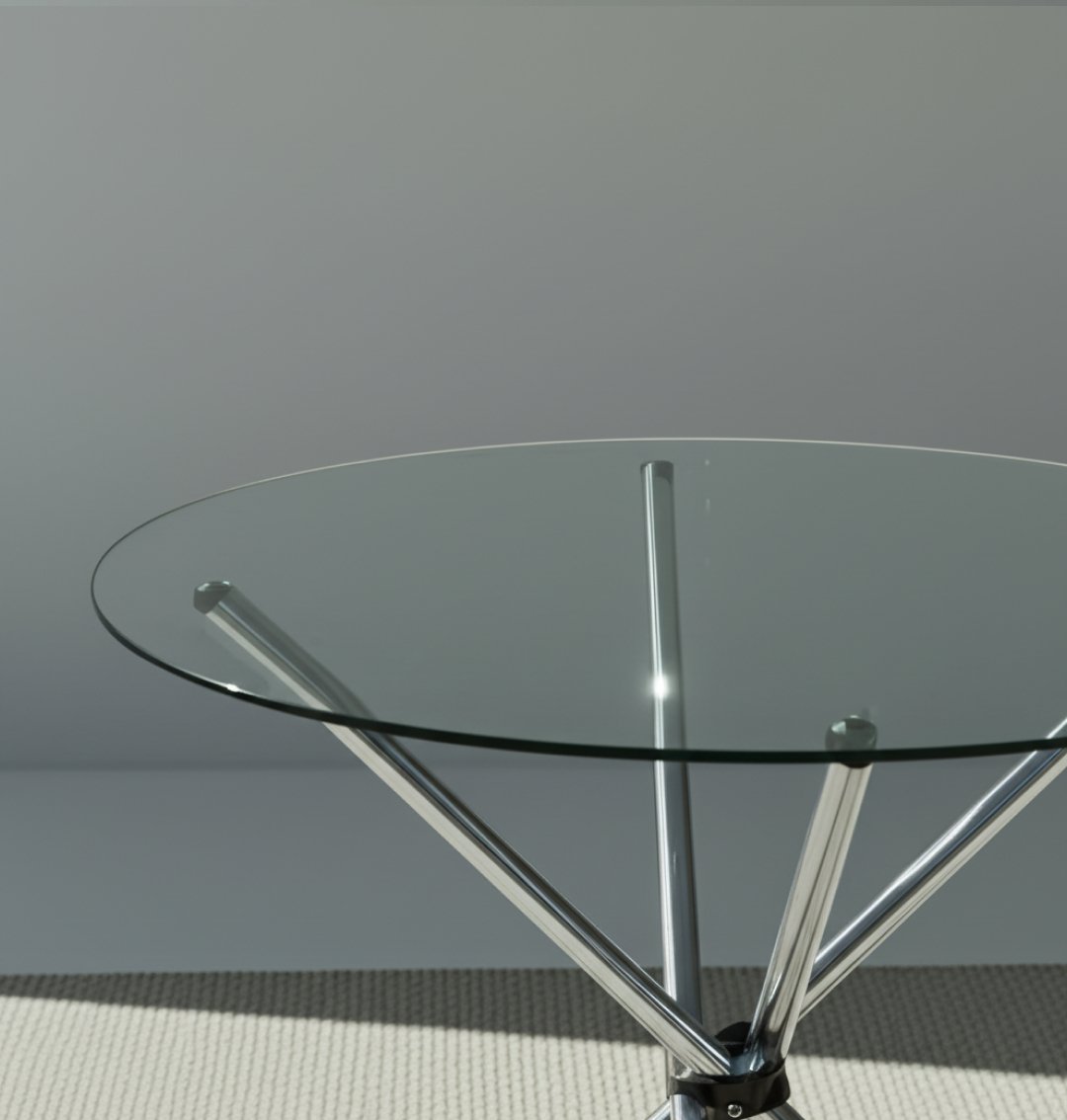 A estrutura metálica e o tampo de vidro encontram-se em bom estado estrutural. Sendo um artigo proveniente de armazém, apresenta sinais típicos de logística, como pó acumulado e marcas superficiais de manuseamento no vidro e no metal. Uma limpeza rápida com limpa-vidros e um pano de microfibras devolve o aspeto cristalino ao vidro e o brilho espelhado aos pés metálicos, deixando a peça impecável.