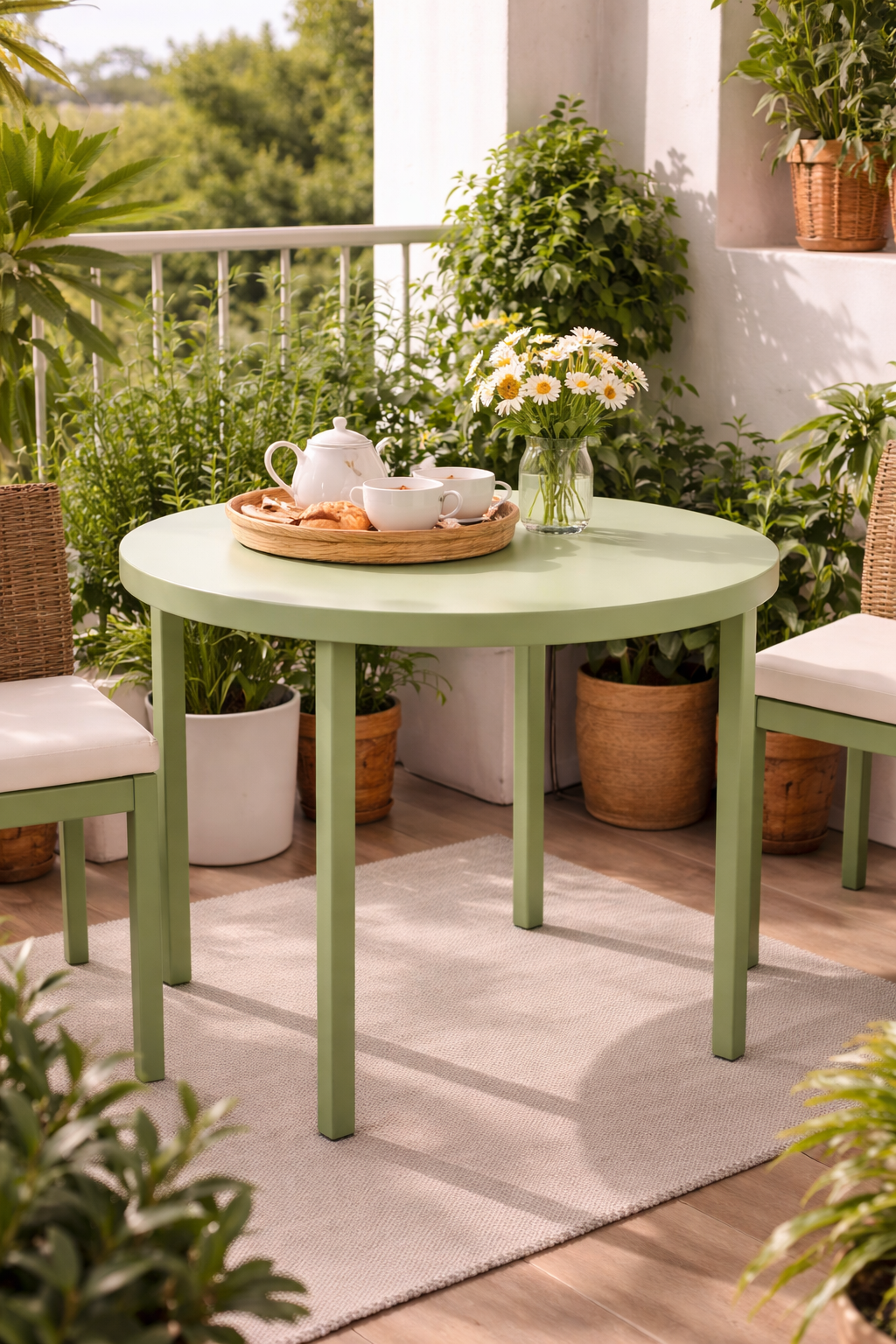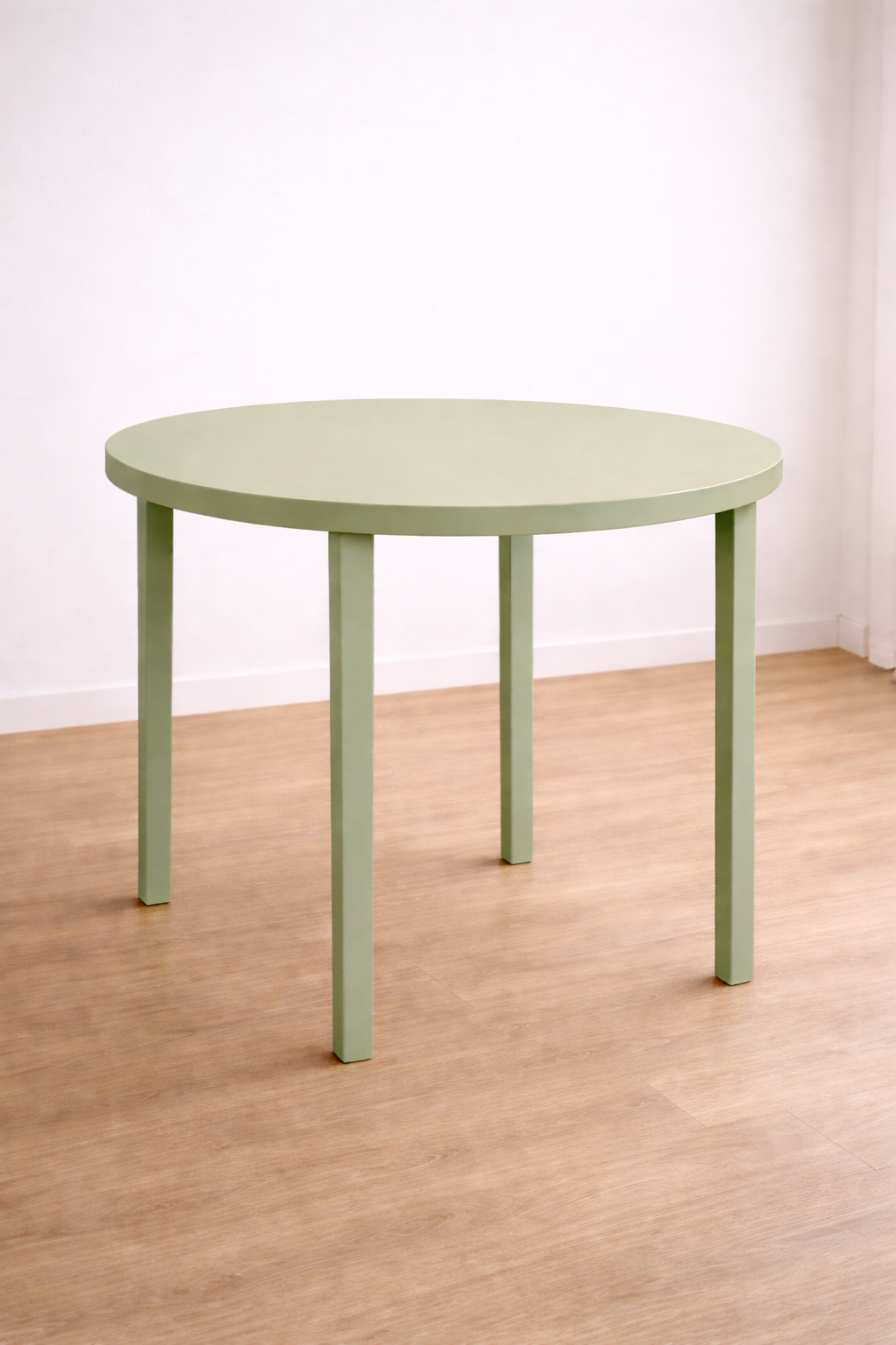 Mesa redonda de linhas simples e contemporâneas, pintada num tom verde-água suave. O tampo liso e os pés retos de secção quadrada conferem-lhe um visual limpo e equilibrado, ideal para salas de jantar, cozinhas luminosas ou espaços descontraídos de inspiração mediterrânica. Uma peça versátil, originalmente de uso hoteleiro, pensada para durabilidade e uso diário.