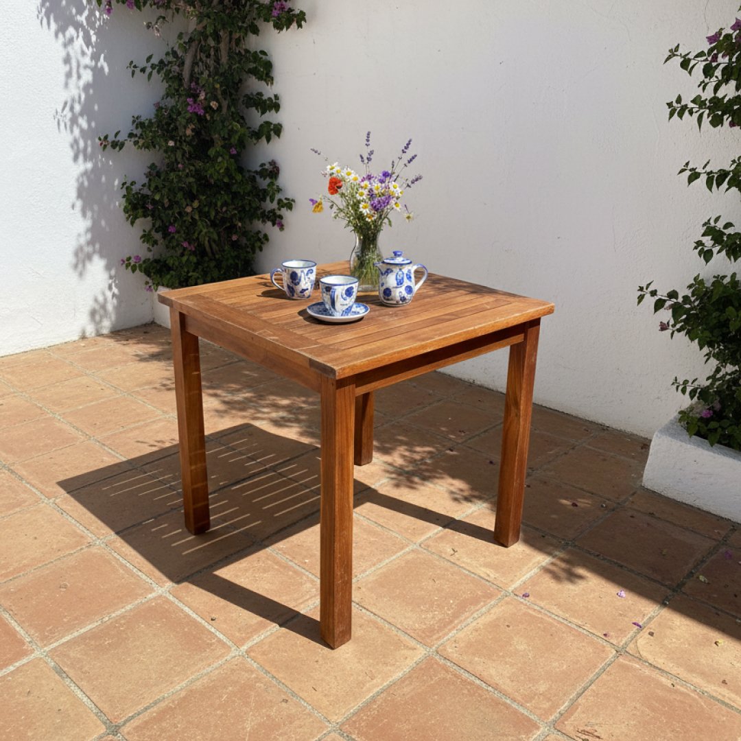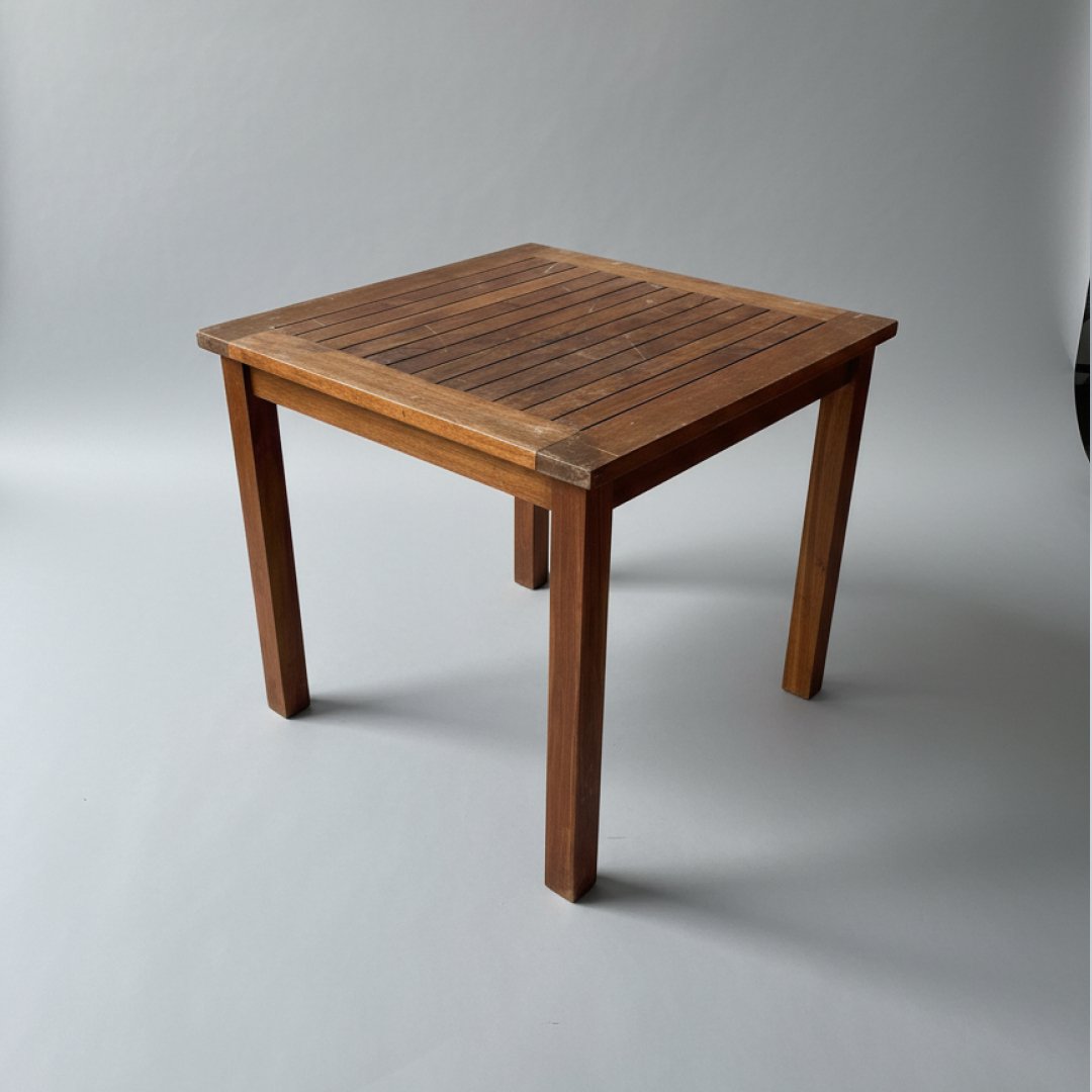 Esta mesa apresenta sinais de uso visíveis, com riscos e desgaste no acabamento do tampo e das arestas. A estrutura em madeira de teca mantém-se sólida e funcional. É uma peça ideal para quem aprecia o aspeto natural da madeira ou para um projeto de restauro, como lixagem e aplicação de óleo de teca.