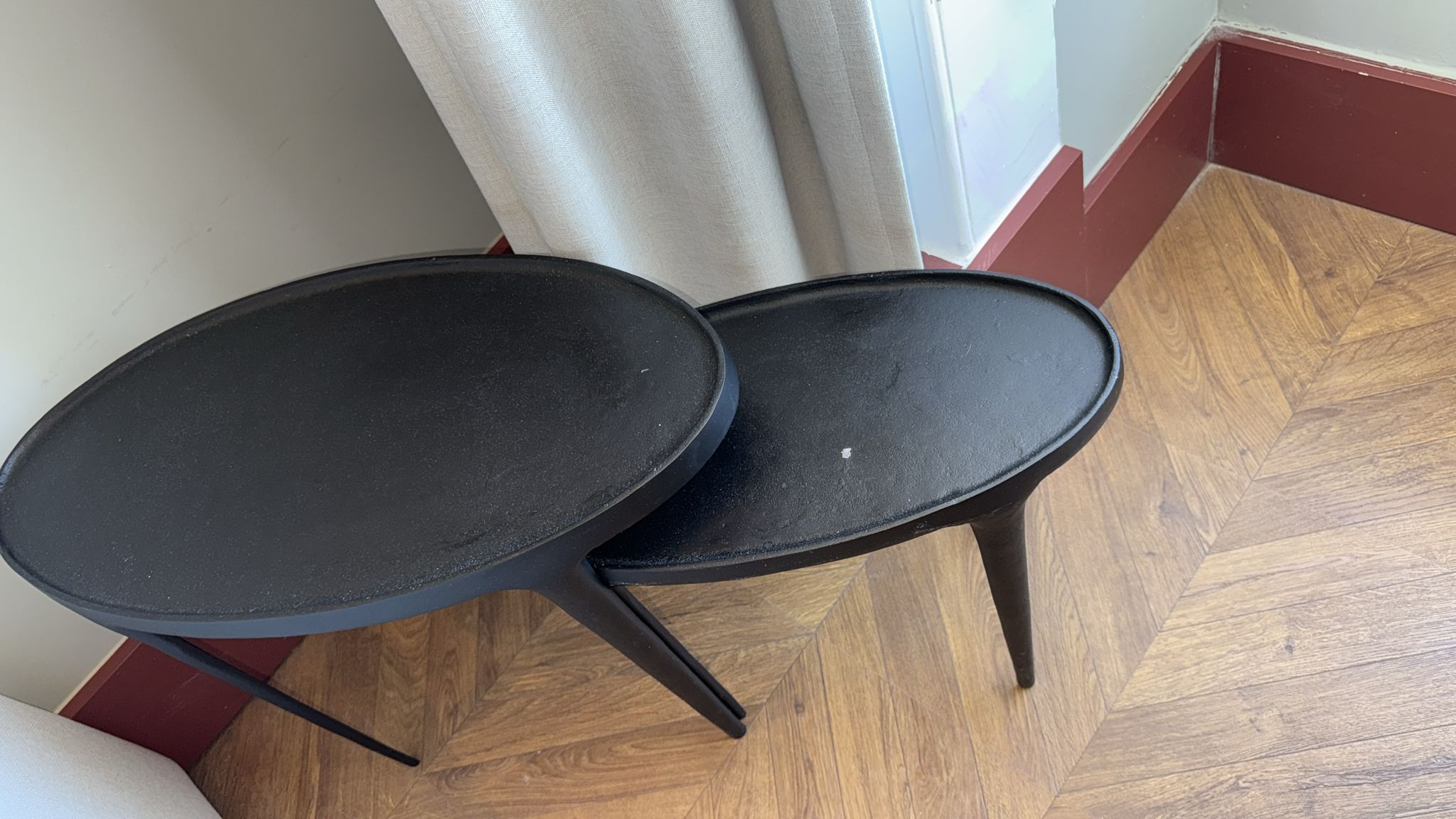Estas mesas de apoio ovais, em cor preta, são perfeitas para adicionar um toque moderno a qualquer ambiente. Fabricadas em metal, oferecem durabilidade e um design elegante que combina bem com diversas decorações. São ideais para colocar livros, copos ou decoração ao lado do sofá ou da cama. Além disso, o seu formato empilhável permite um fácil armazenamento e otimização de espaço, tornando-as versáteis para uso em casa ou em pequenos espaços.