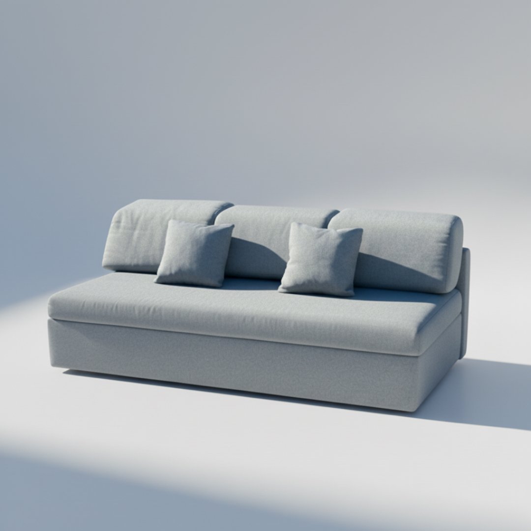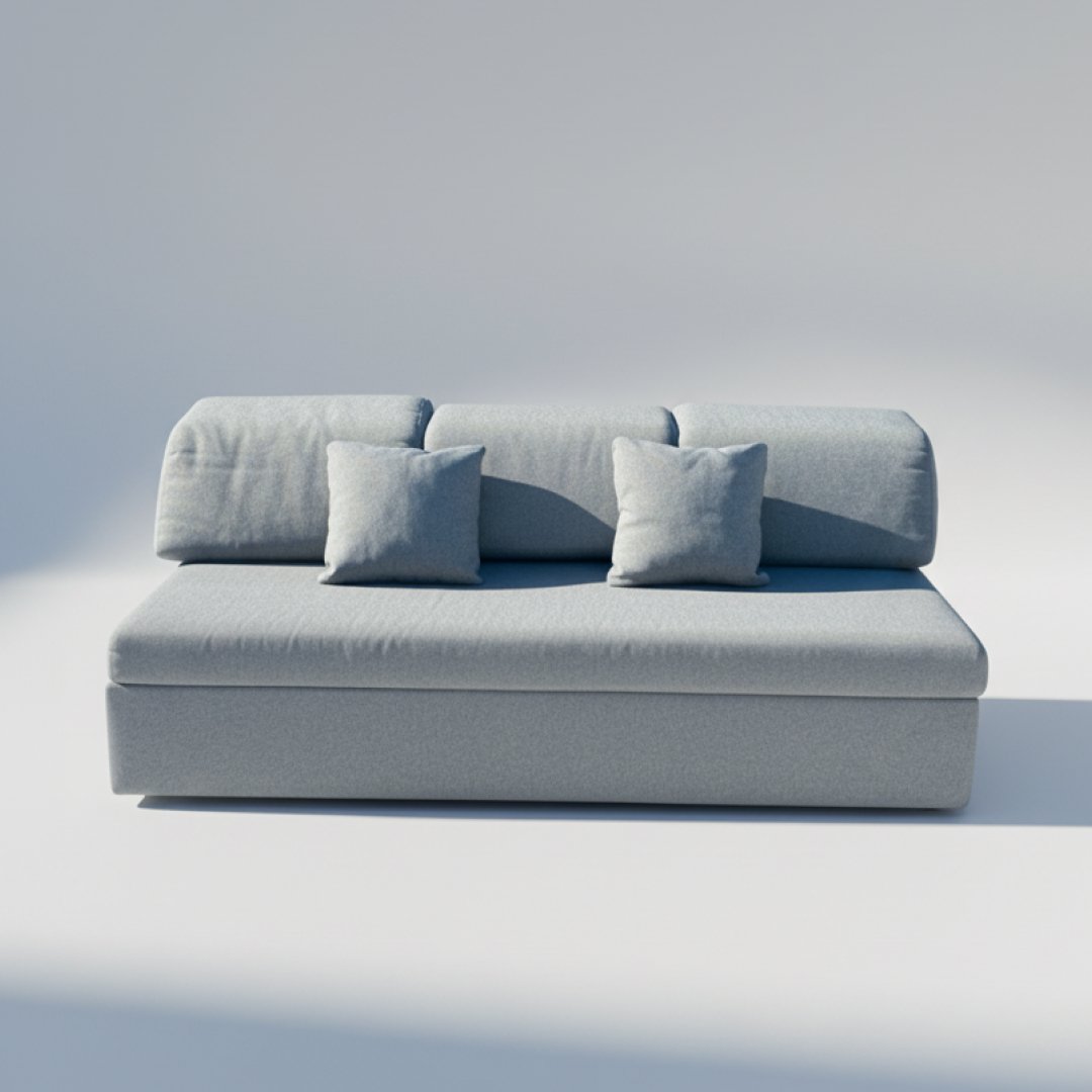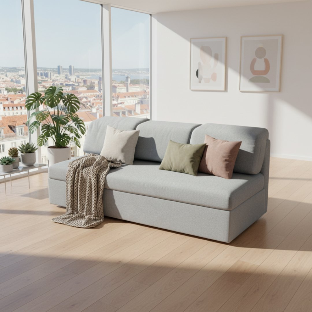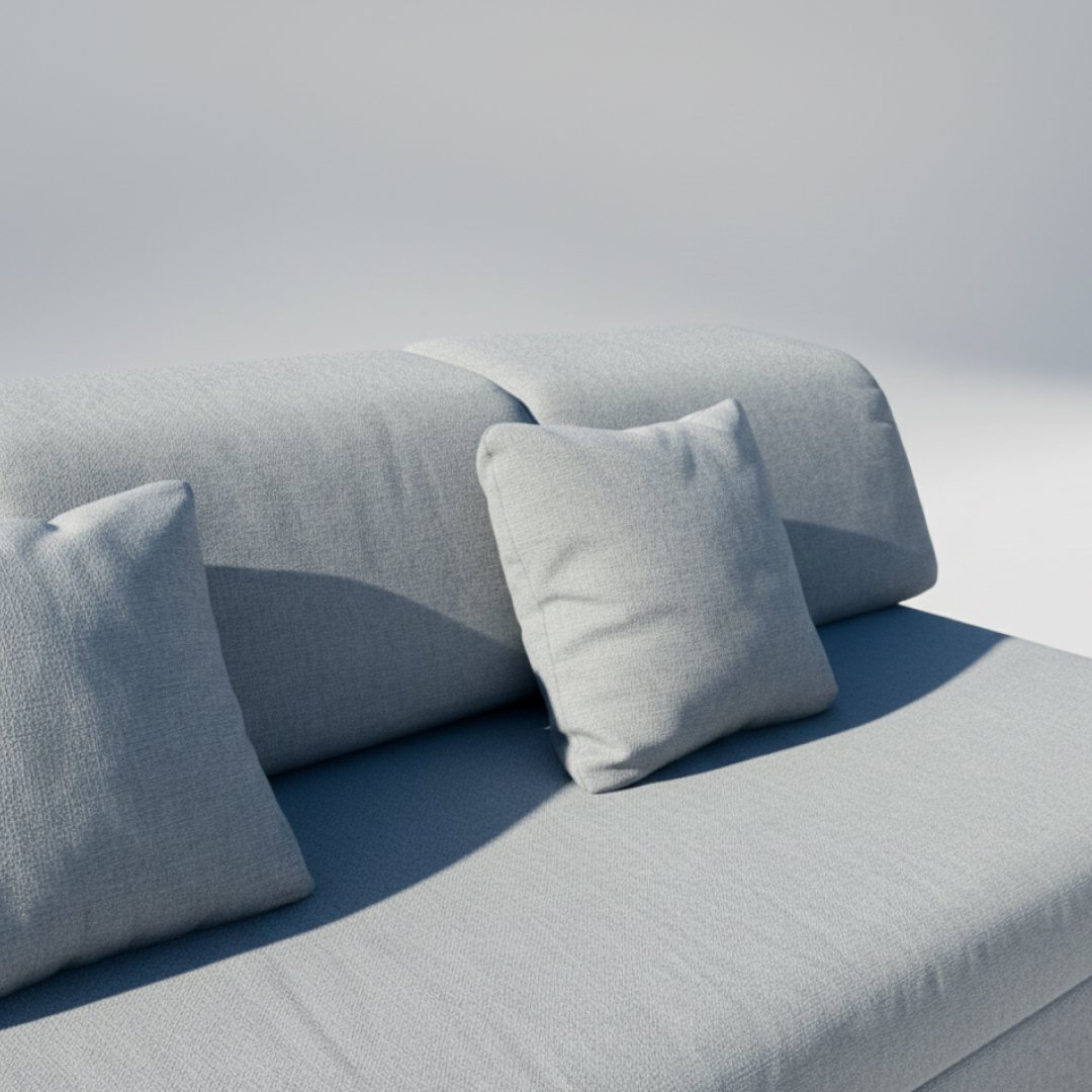Este módulo central de três lugares apresenta um design contemporâneo e versátil, caracterizado pela ausência de braços laterais, o que permite a sua integração fluida em composições modulares maiores ou a sua utilização como uma peça de assento linear independente. O estofo em tecido cinza mesclado é acompanhado por duas almofadas decorativas, mantendo uma estética minimalista e funcional, ideal para salas de estar modernas ou espaços de espera.