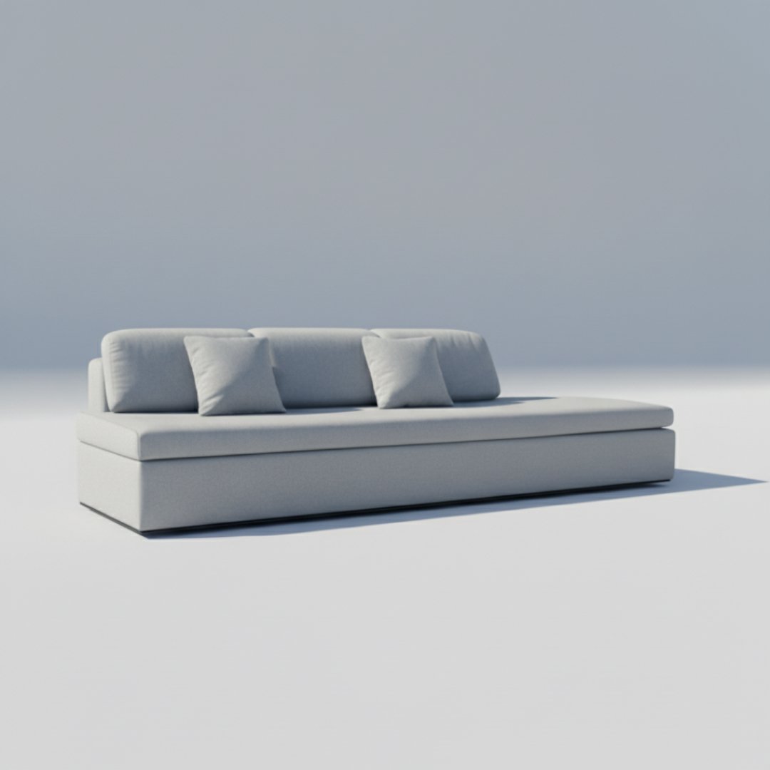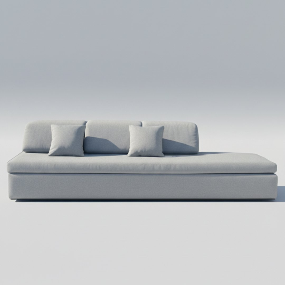 Este módulo de sofá destaca-se pelo seu design extra longo e perfil baixo, funcionando como uma peça de assento contínua ou como base para uma composição modular de grandes dimensões. O estofo em tecido cinza mesclado apresenta uma textura resistente e moderna, sendo acompanhado por duas almofadas decorativas quadradas que oferecem conforto adicional. A ausência de braços numa das extremidades reforça a sua versatilidade e estética minimalista.
