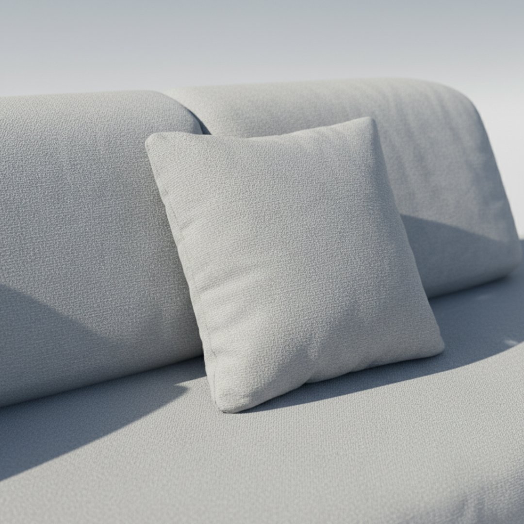 A estrutura interna e a base de suporte encontram-se sólidas e estáveis. O estofo apresenta marcas de armazenamento, incluindo sombras superficiais de pó e marcas de pressão no tecido resultantes do empilhamento e acondicionamento em armazém. Uma limpeza têxtil simples ou aspiração profunda uniformiza o tom cinza e revitaliza a textura, eliminando as marcas de logística.