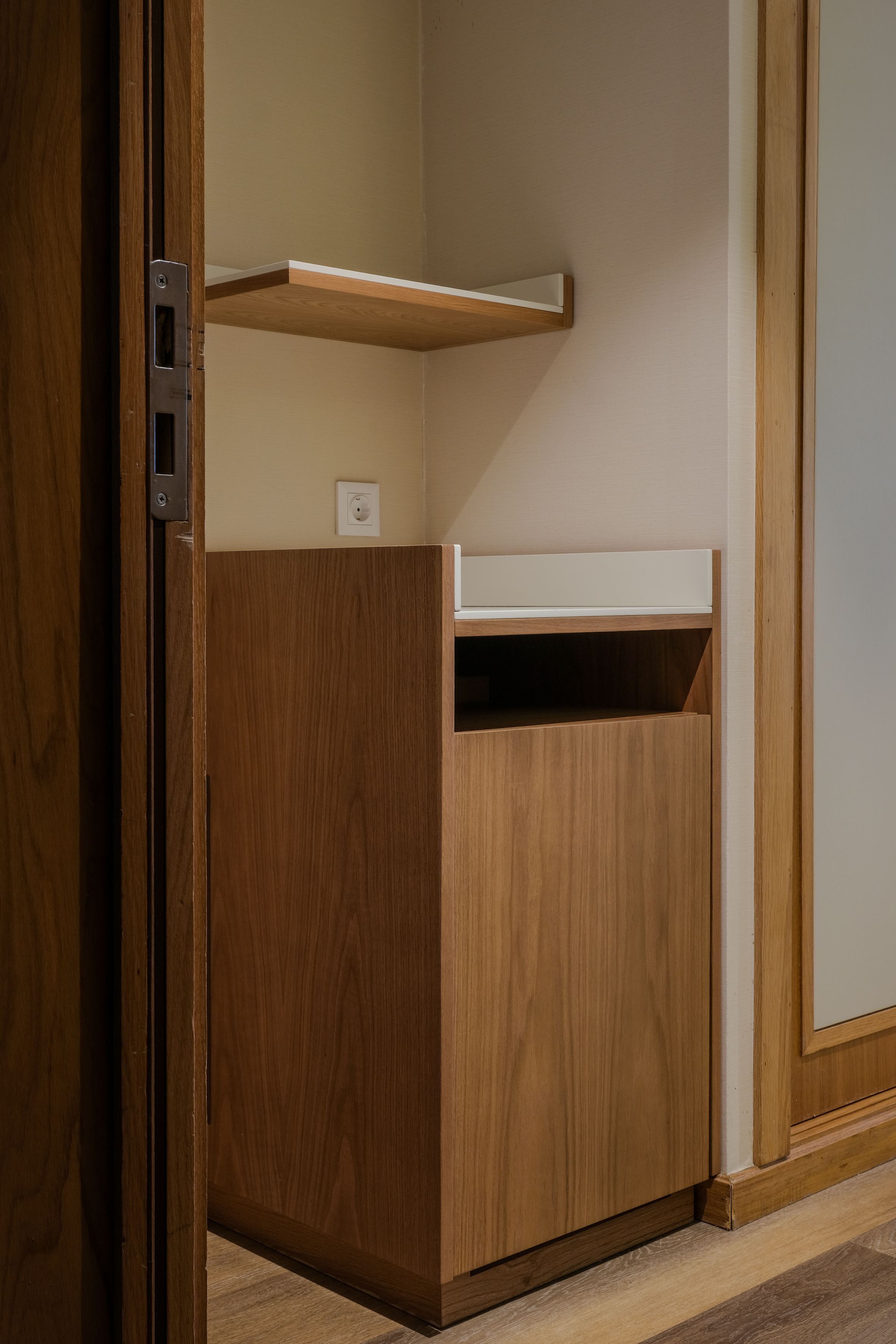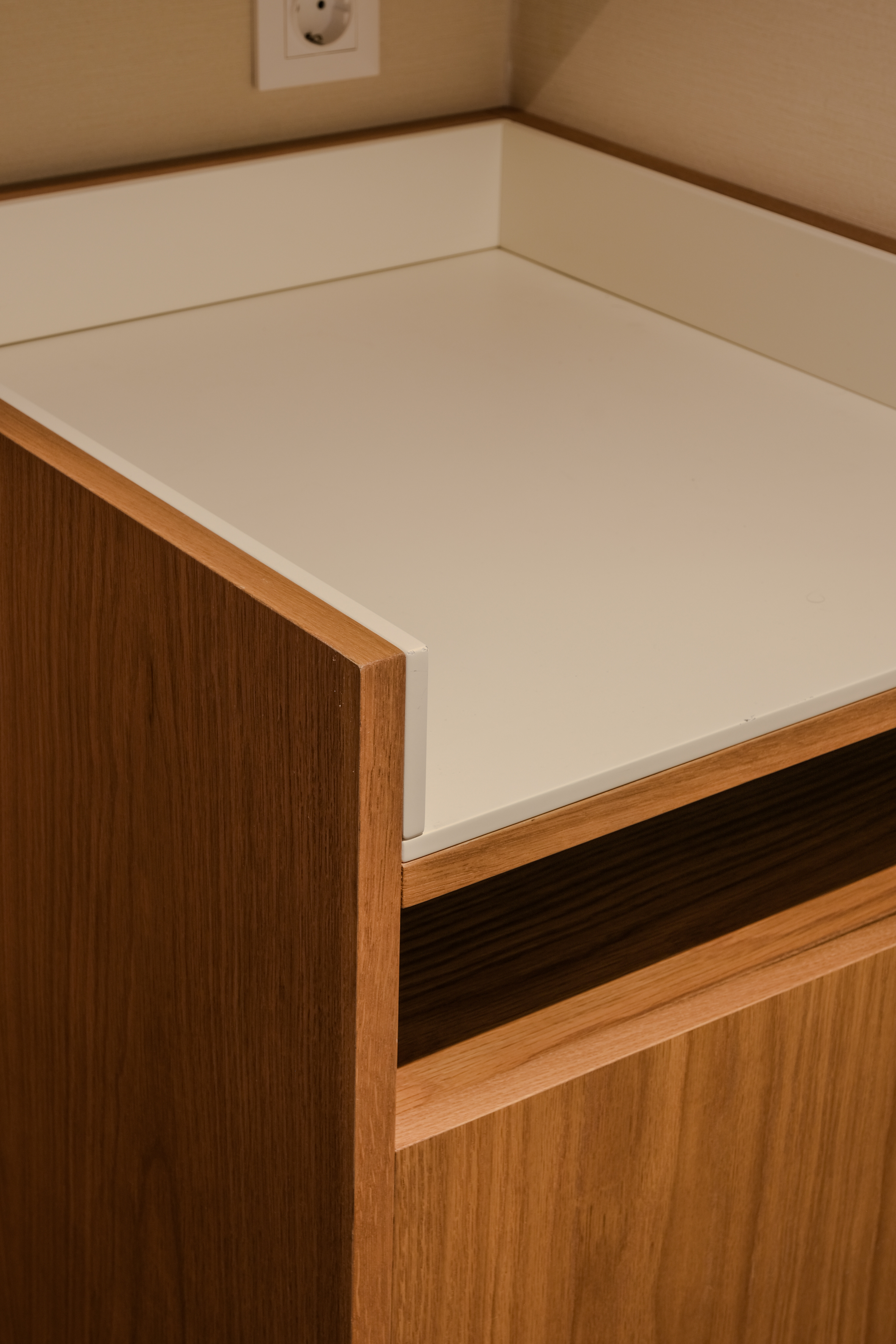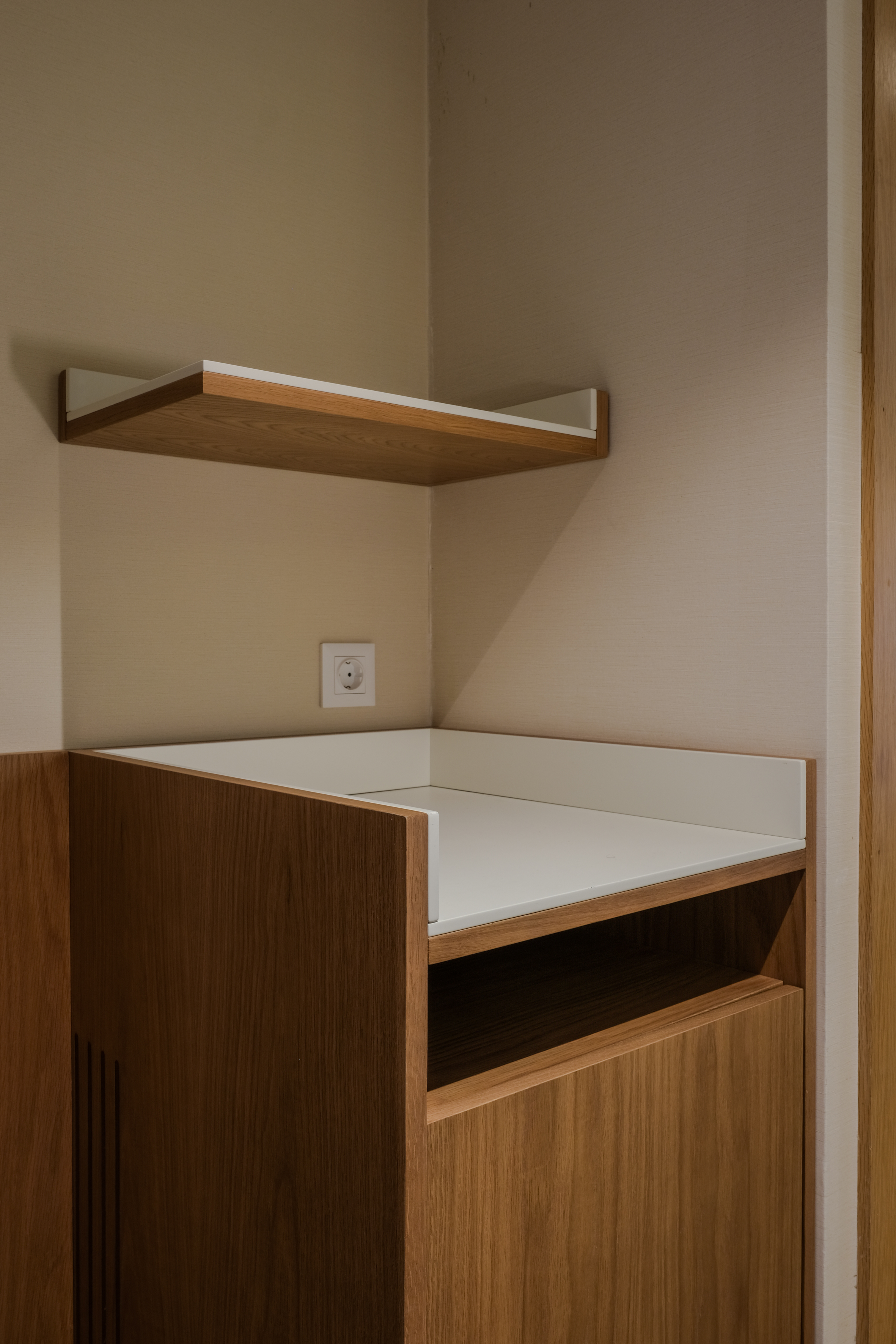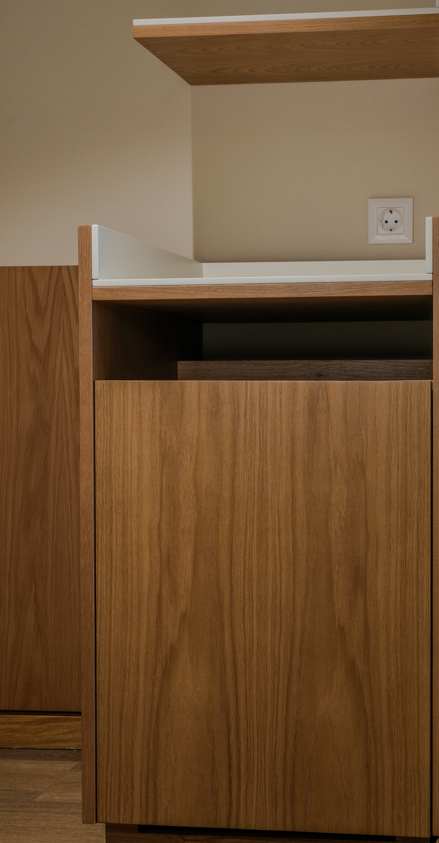 Móvel funcional e compacto, ideal para servir como móvel bar, apoio de quarto ou mini-despensa. Fabricado em madeira com acabamento natural, tem porta frontal para arrumação discreta e tampo em fórmica branca, resistente e fácil de limpar.
