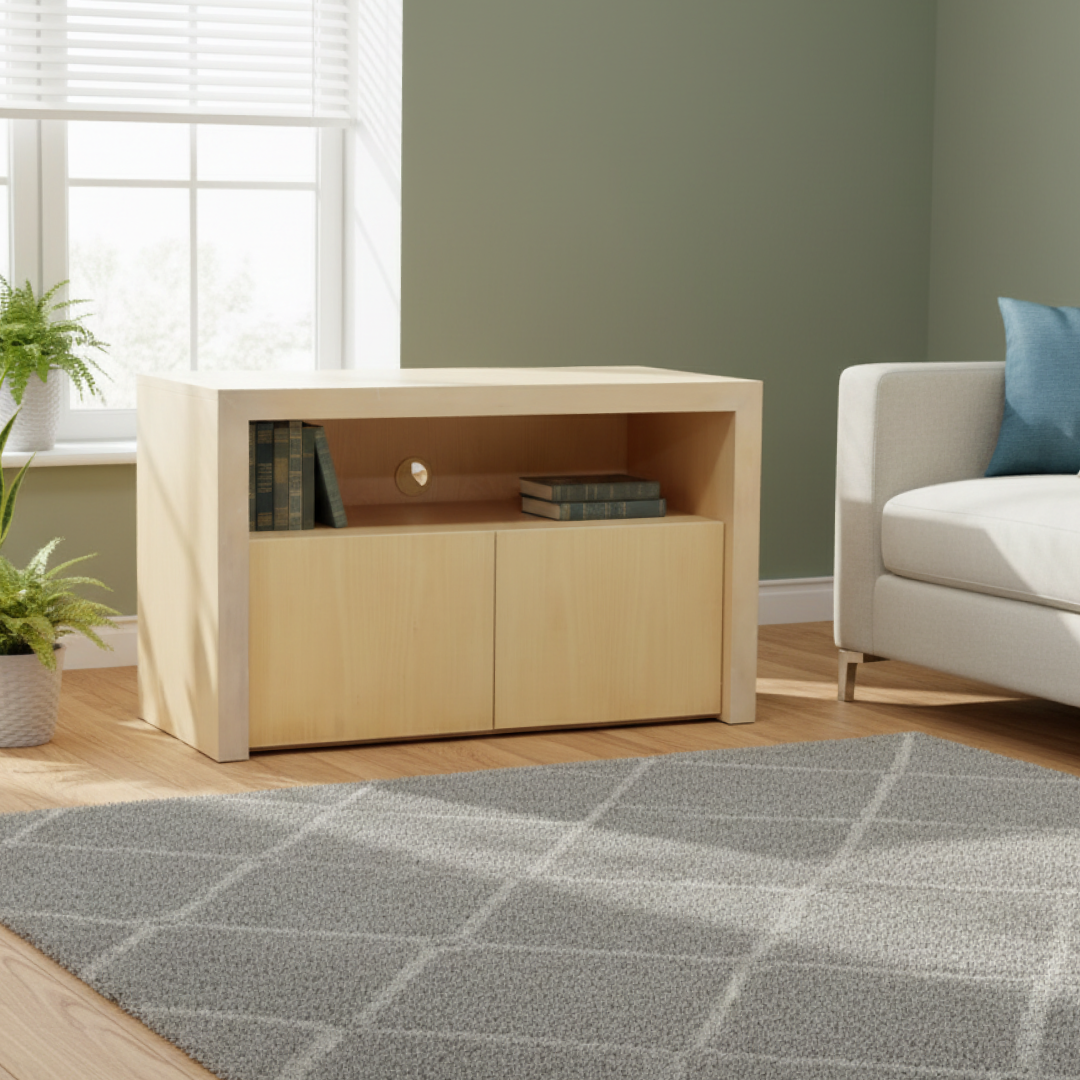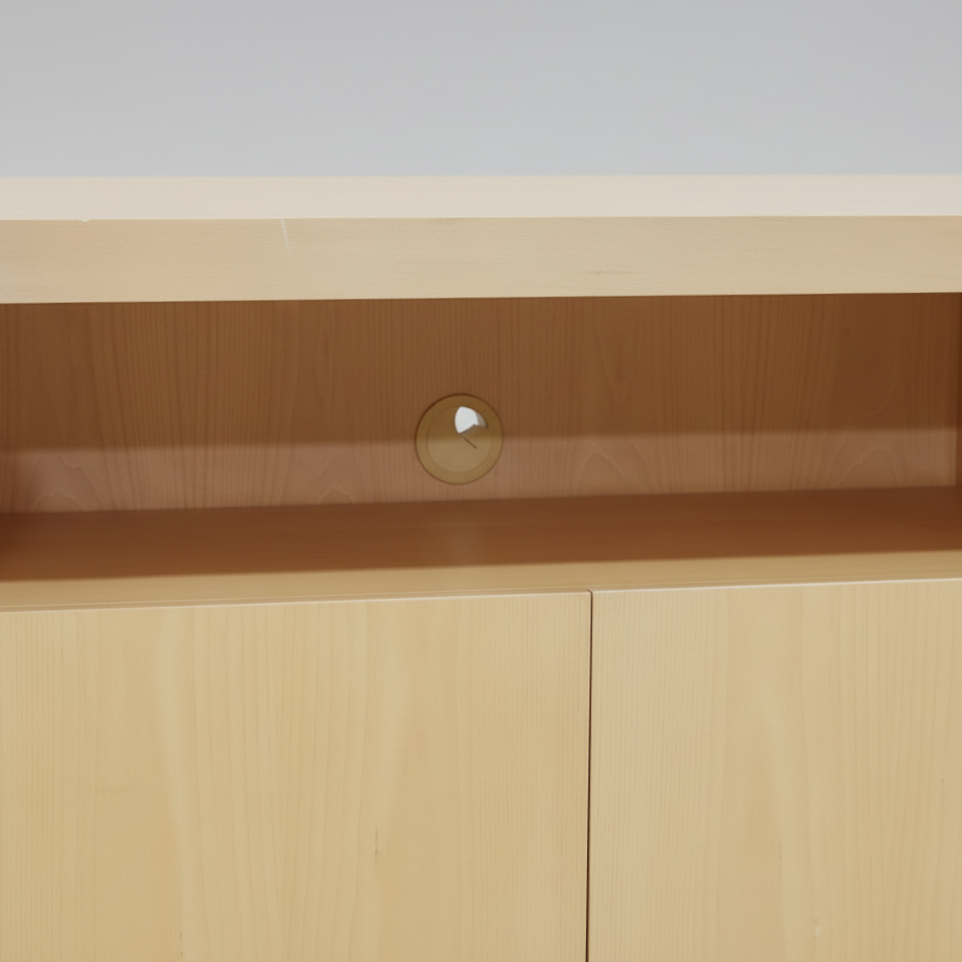 Movél TV em madeira com acabamento claro e linhas retas. A estrutura foi projetada para a máxima versatilidade, apresentando três áreas de armazenamento distintas. O nicho superior aberto é ideal para equipamentos eletrónicos, consolas ou acessórios de serviço que necessitem de acesso rápido. Na parte inferior, as duas portas ocultam um compartimento generoso, perfeito para arrumação discreta de objetos maiores.