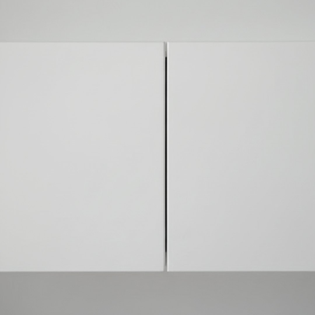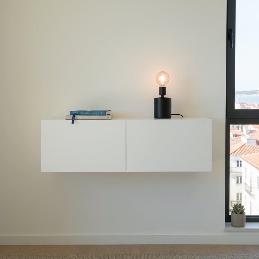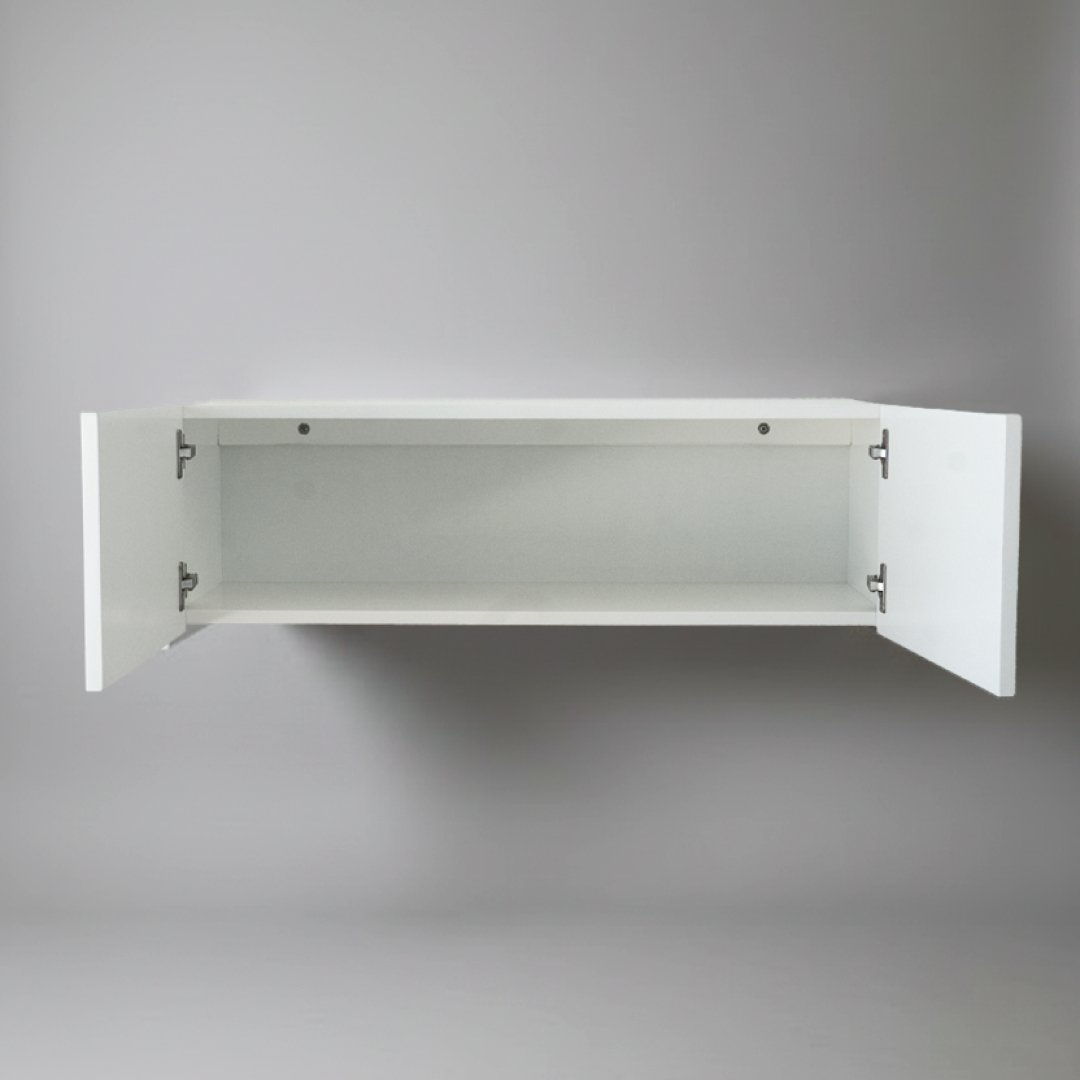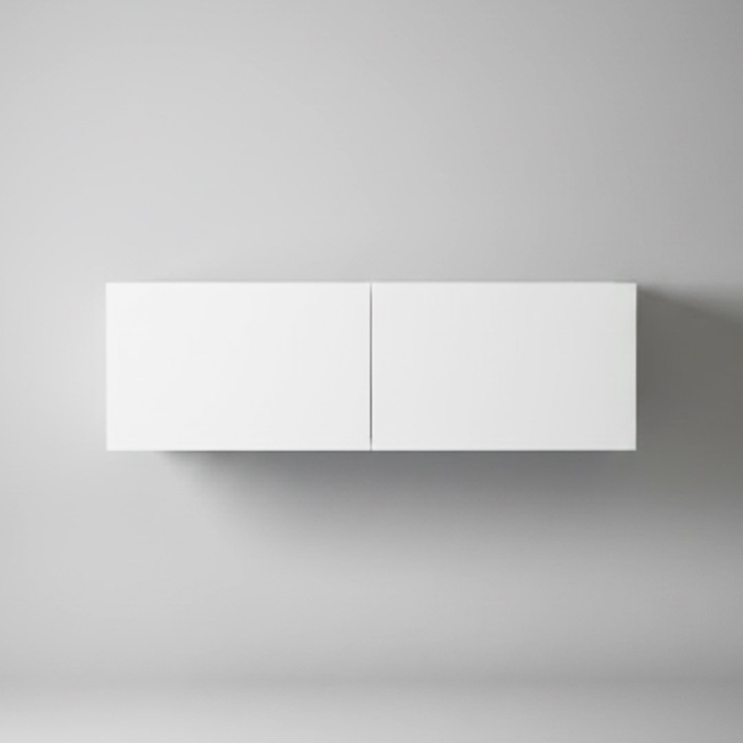 Móvel de TV suspenso com design modular e acabamento lacado a branco. A peça é composta por dois compartimentos frontais de linhas geométricas puras, sem puxadores visíveis, reforçando uma estética moderna e limpa. Por ser um artigo proveniente de hotelaria, pode apresentar algum pós de uso decorrente do armazenamento, mas a sua superfície é de fácil manutenção com um pano húmido.