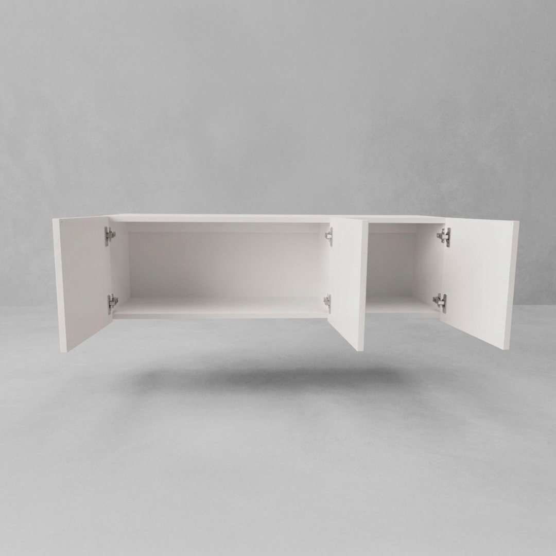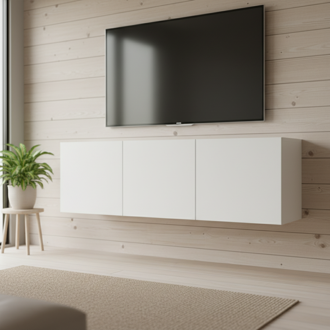 Móvel de TV suspenso com design modular e acabamento lacado a branco. A peça é composta por três compartimentos frontais de linhas geométricas puras, sem puxadores visíveis, reforçando uma estética moderna e limpa. Por ser um artigo proveniente de hotelaria, pode apresentar algum pós de uso decorrente do armazenamento, mas a sua superfície é de fácil manutenção com um pano húmido.