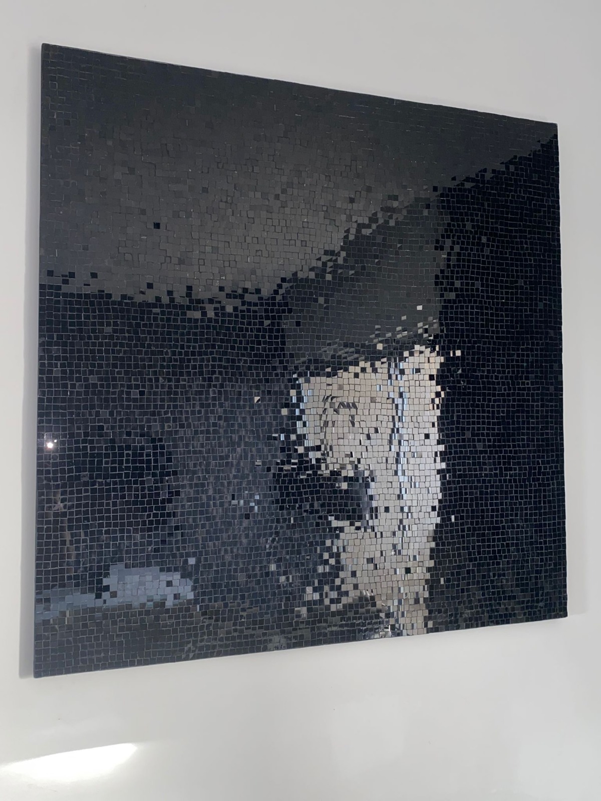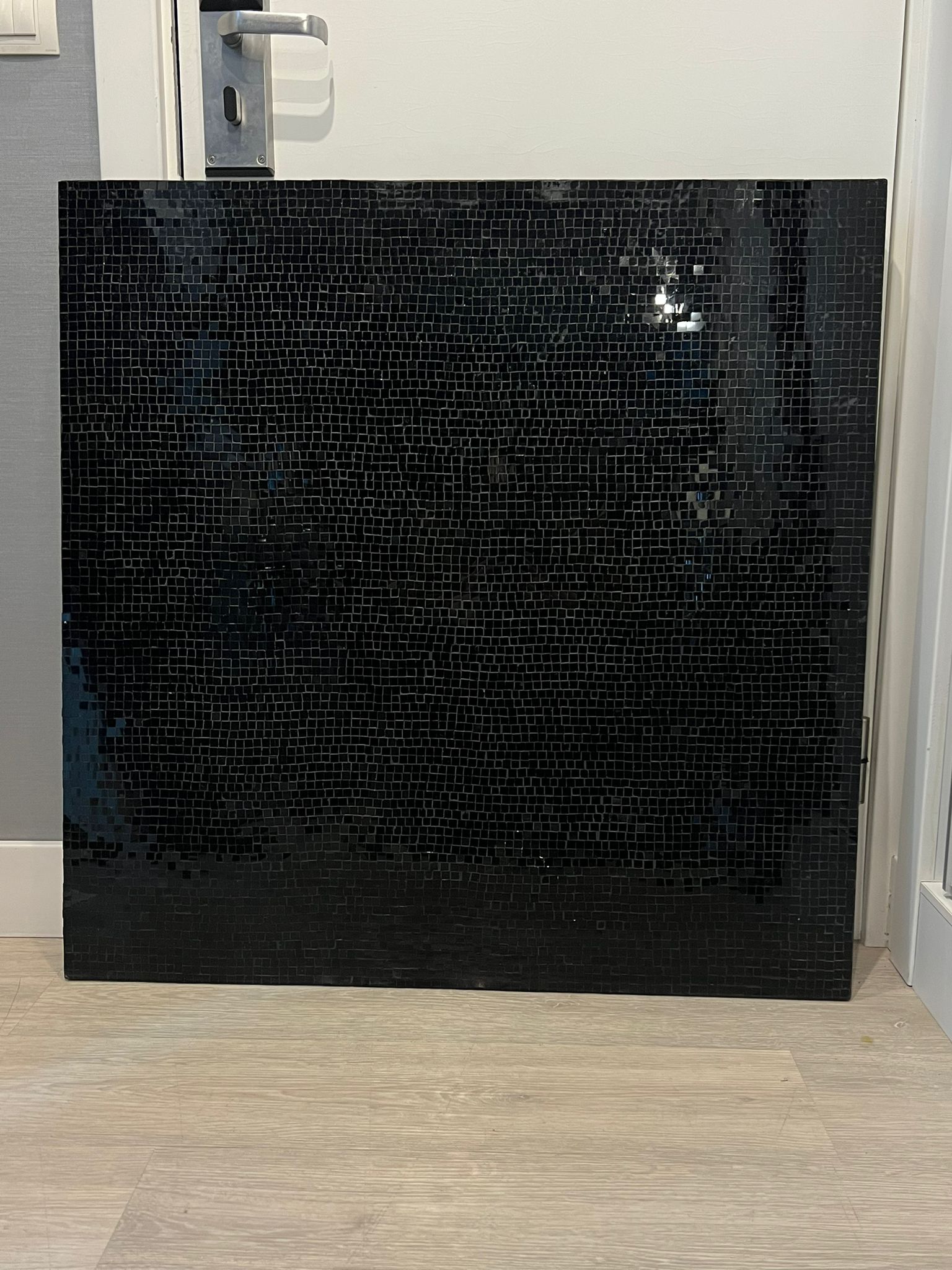 Painel decorativo com acabamento em mosaico, em tons escuros. Peça de caráter contemporâneo, adequada para valorizar espaços interiores.