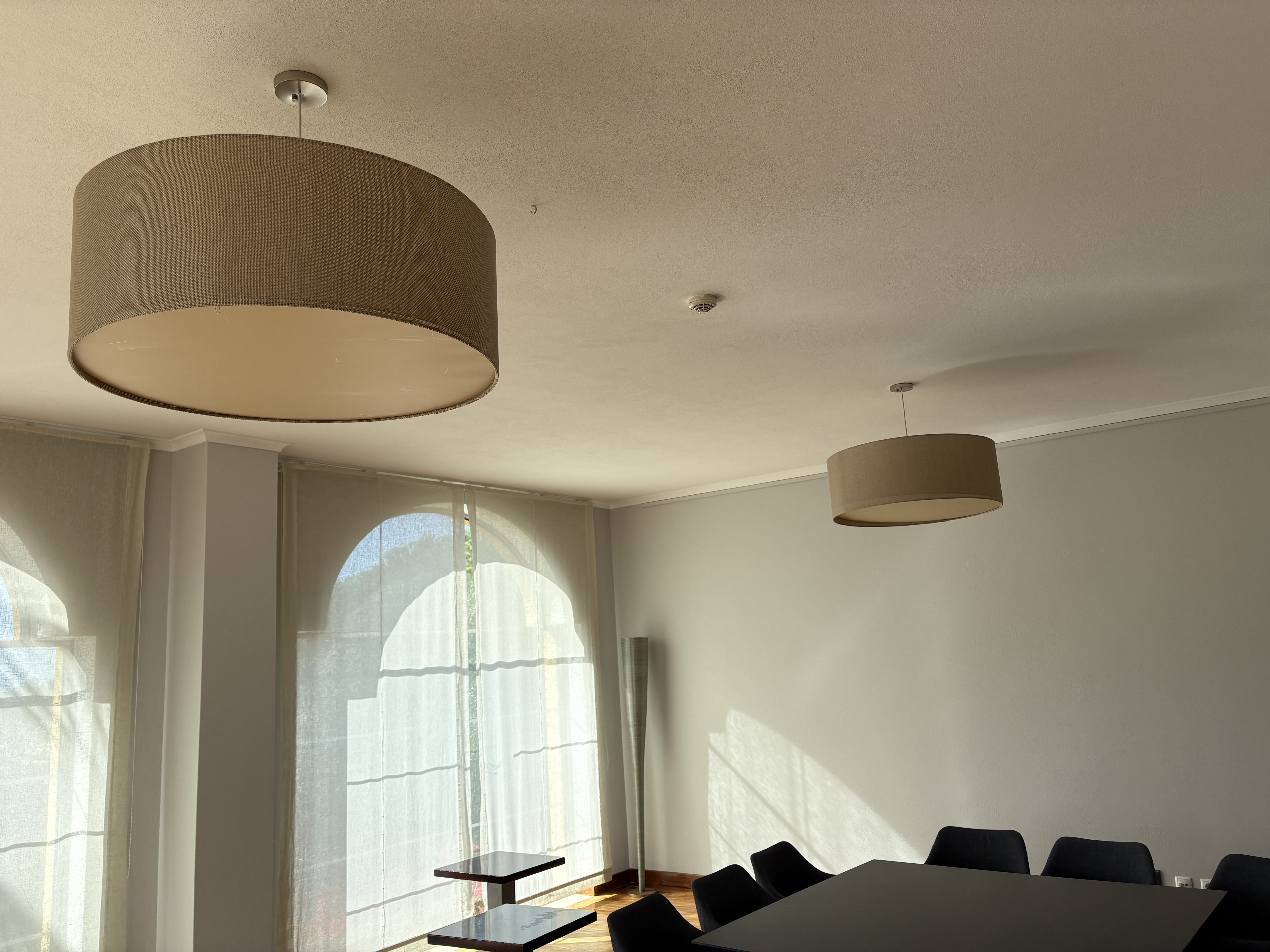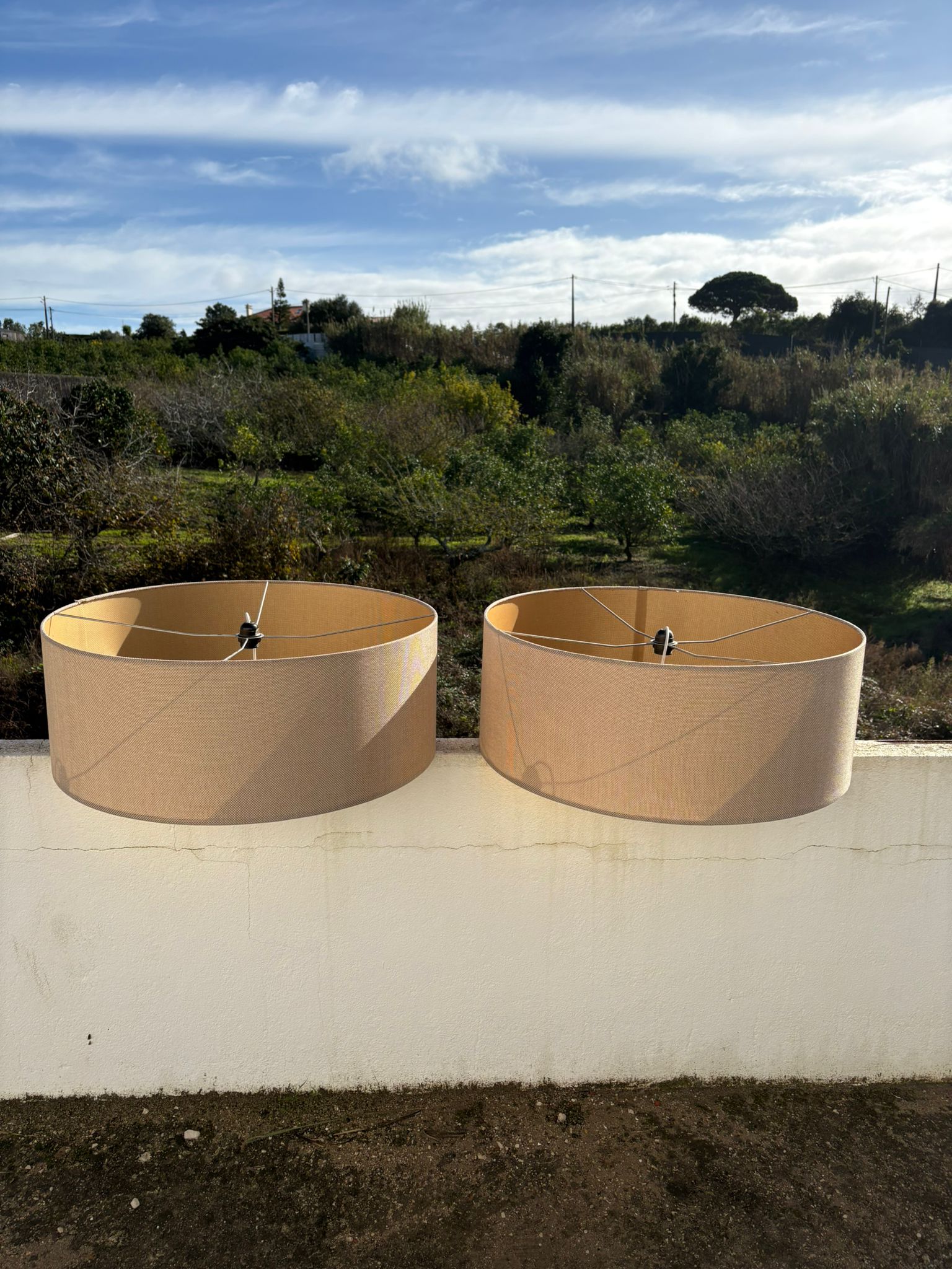 Conjunto de dois abat-jours cilíndricos em tecido bege, com estrutura interior metálica. Têm um design simples e elegante, perfeito para candeeiros de teto, de pé ou de mesa. Os tons neutros adaptam-se facilmente a diferentes estilos de decoração, criando um ambiente acolhedor e contemporâneo.