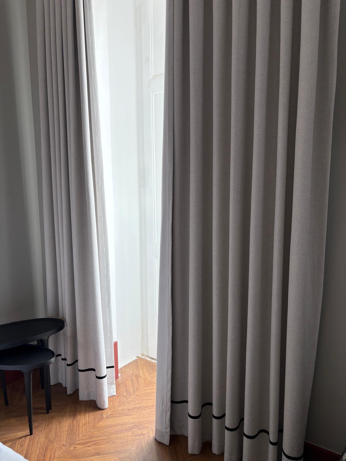 Conjunto de cortinas em tecido grosso, de cor neutra (bege/cinza claro), ideais para quarto ou sala.