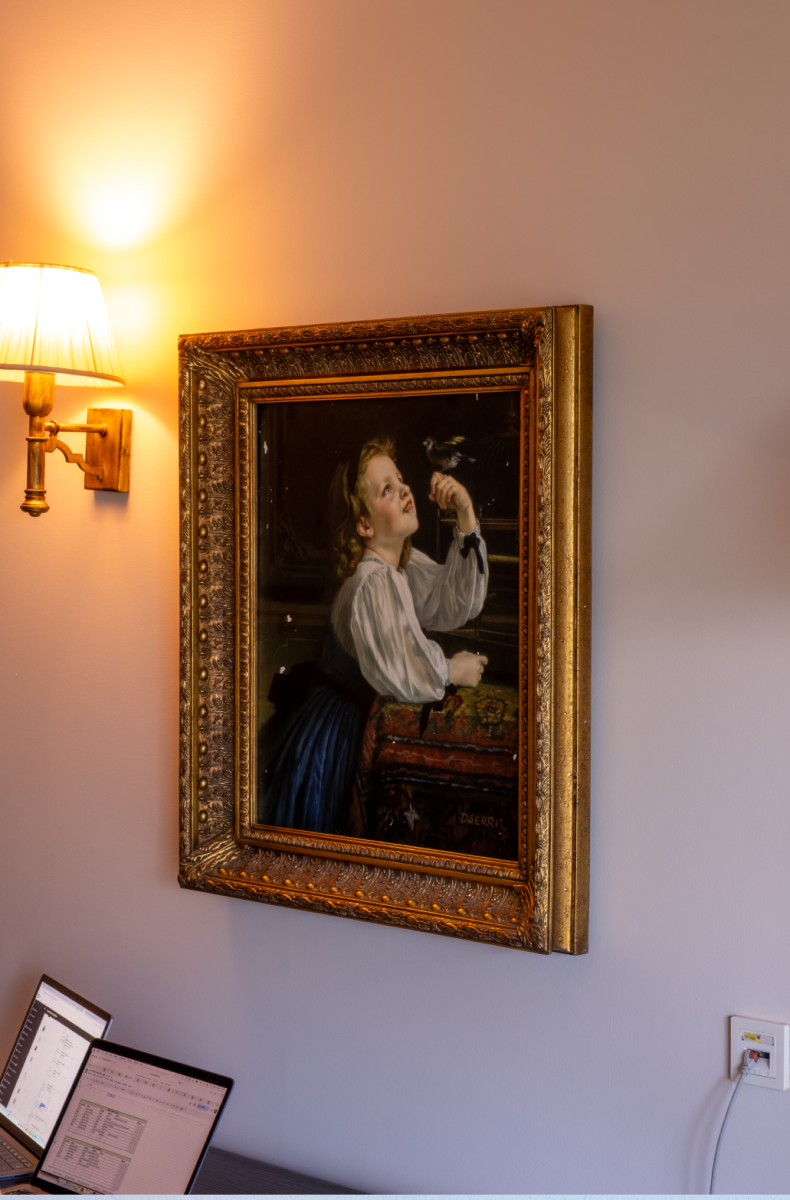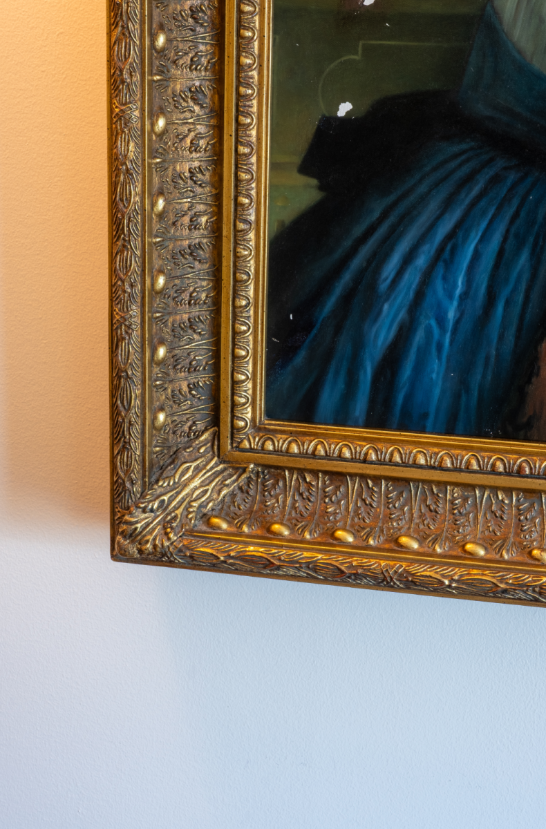 A peça é apresentada numa moldura trabalhada com acabamento em folha de ouro, que eleva o conjunto e reforça o seu caráter artístico. Por ser um artigo em segunda mão proveniente de um contexto de hotelaria de luxo, combina durabilidade com um design intemporal.