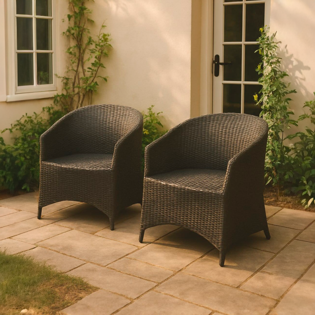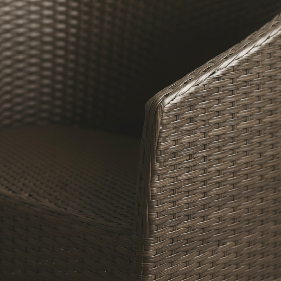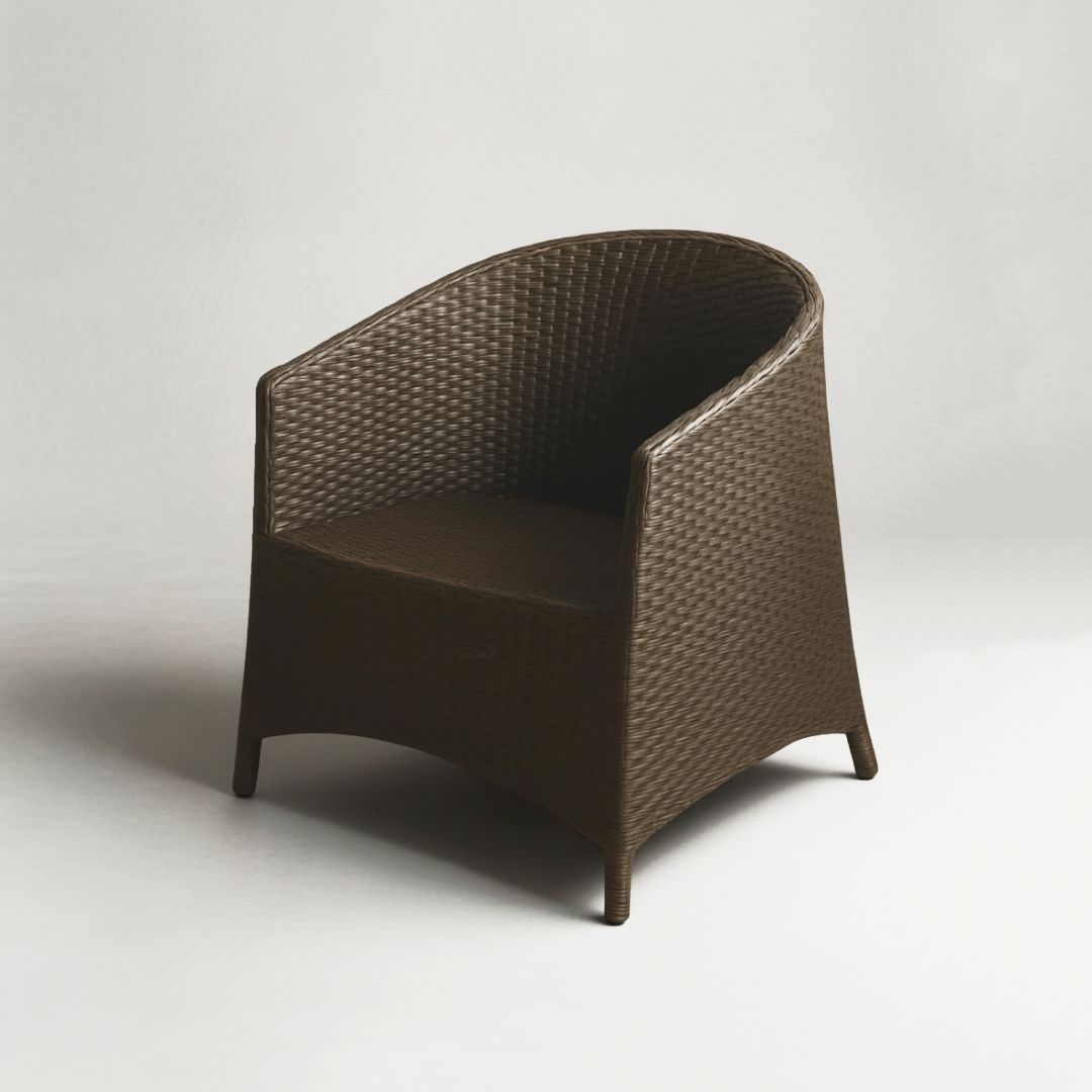 Poltrona de exterior com design envolvente, fabricada em polietileno trançado de alta durabilidade em tom castanho chocolate. A sua estrutura ergonómica e o material resistente às intempéries tornam-na a escolha ideal para jardins, terraços ou zonas de lounge junto à piscina.