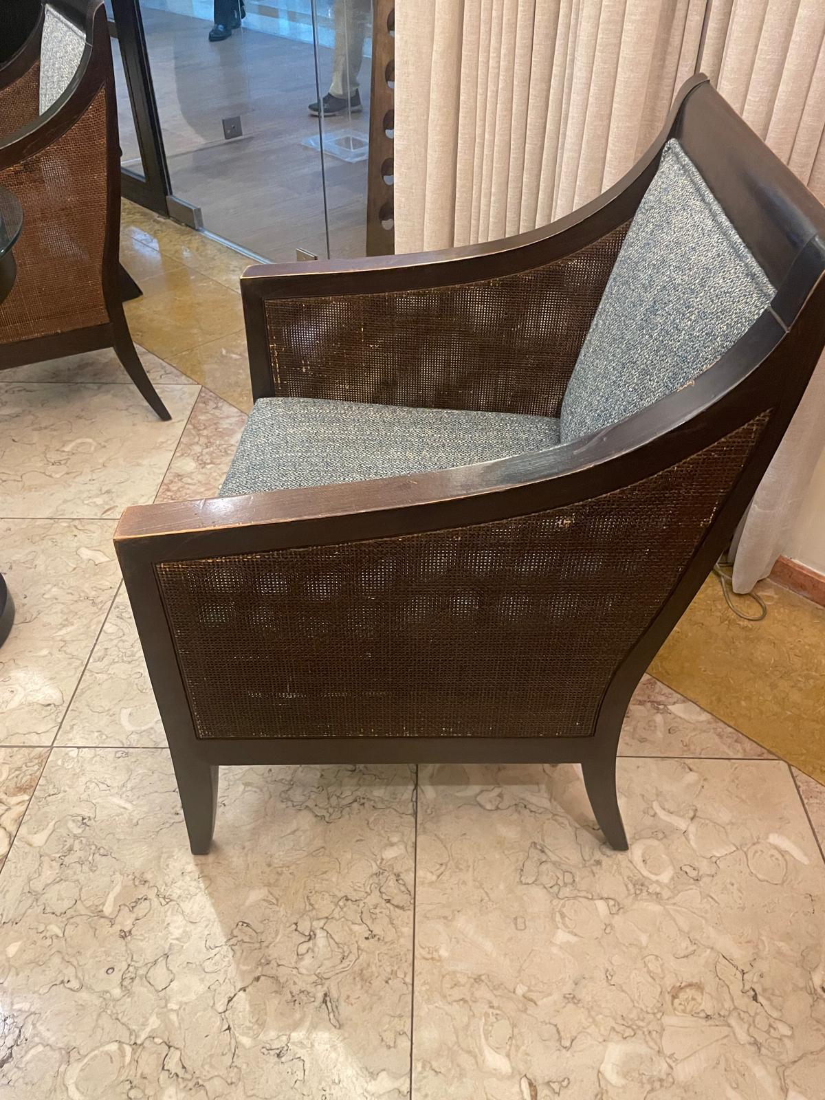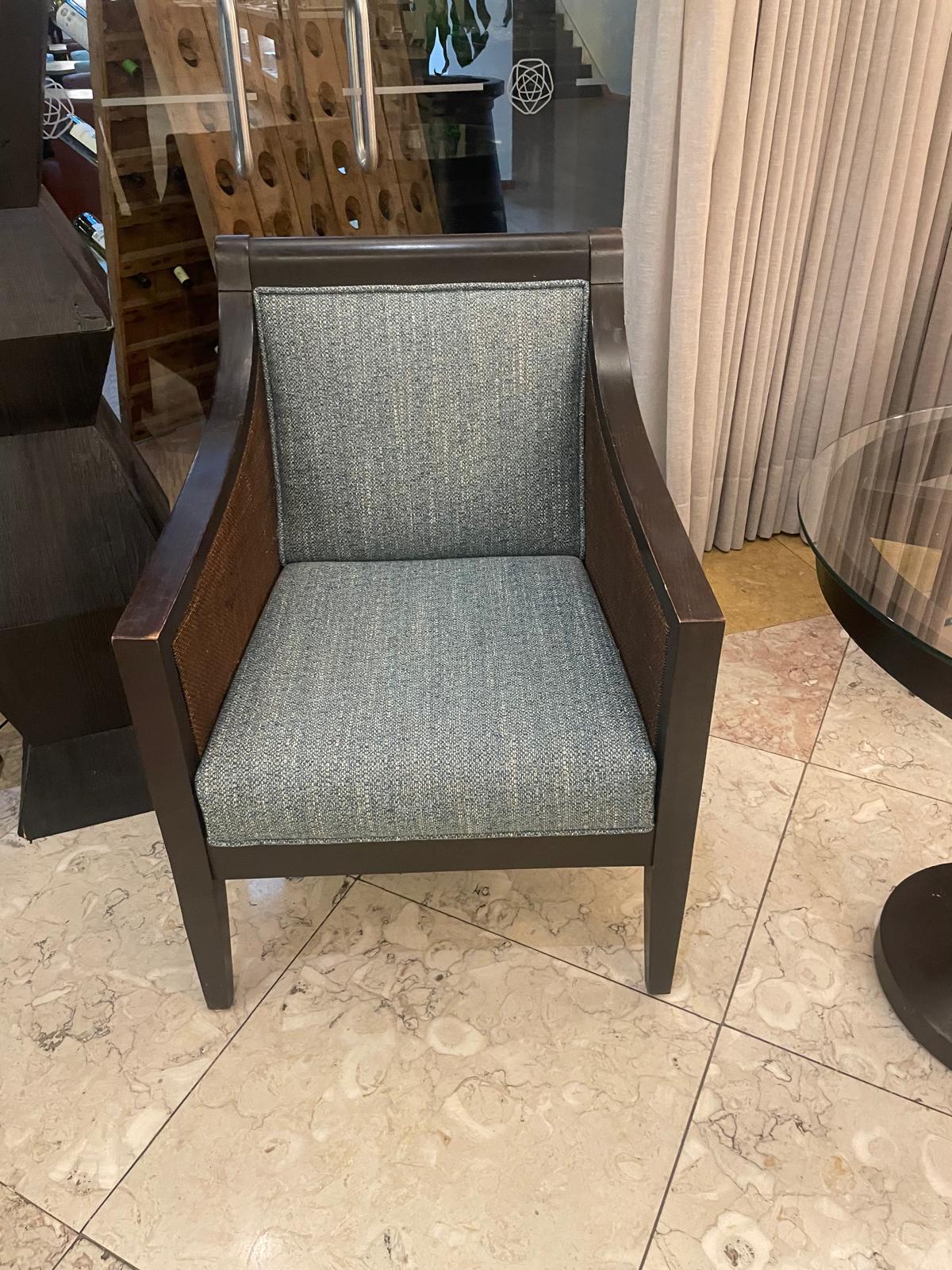 Poltrona de estilo clássico, com estrutura robusta em madeira escura e acabamento elegante. O assento e o encosto são estofados em tecido azul texturado, proporcionando conforto e um toque contemporâneo ao design tradicional. As laterais em madeira curva conferem presença e sofisticação, típicas do mobiliário de hotelaria.