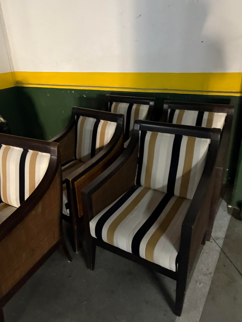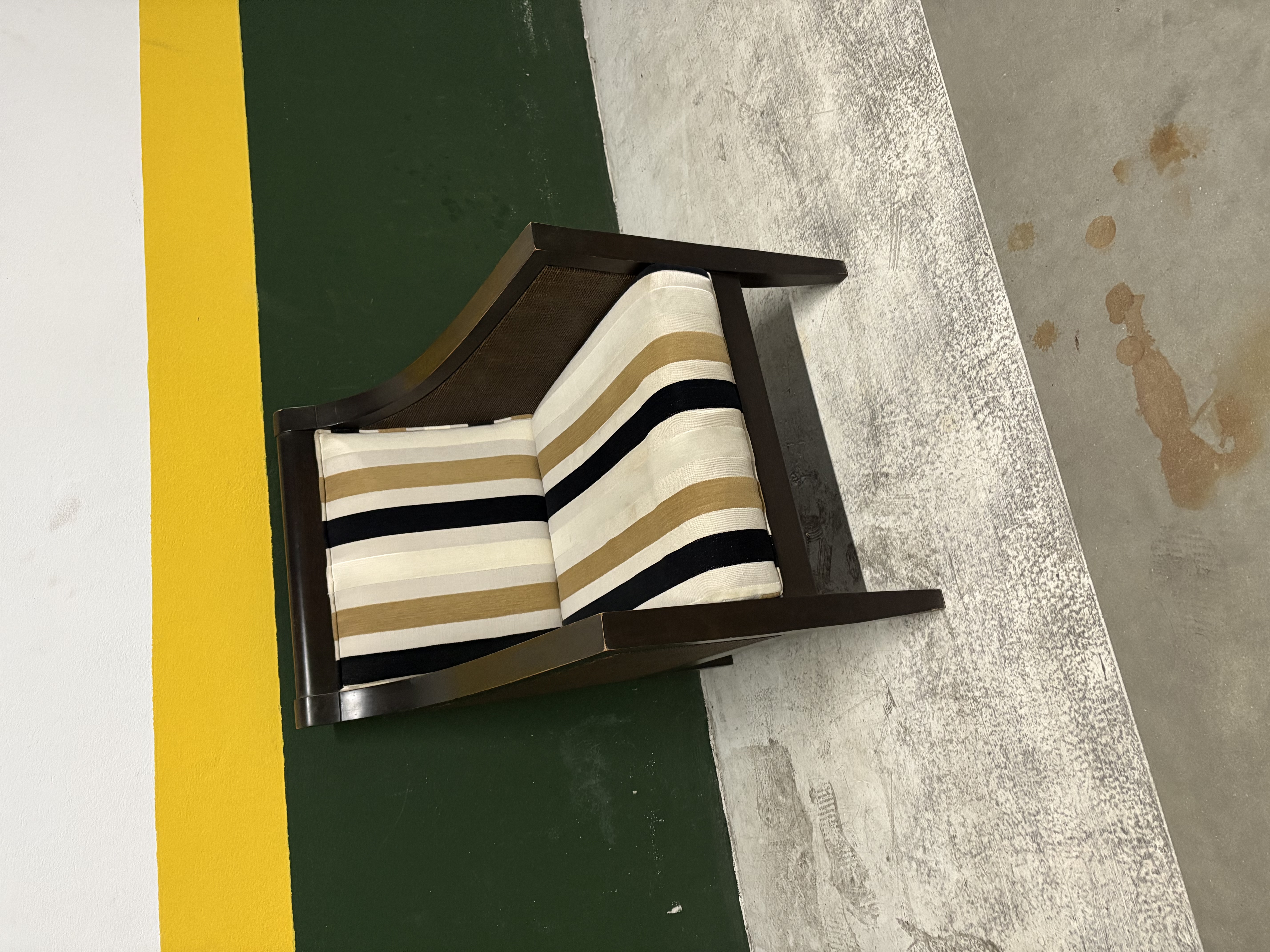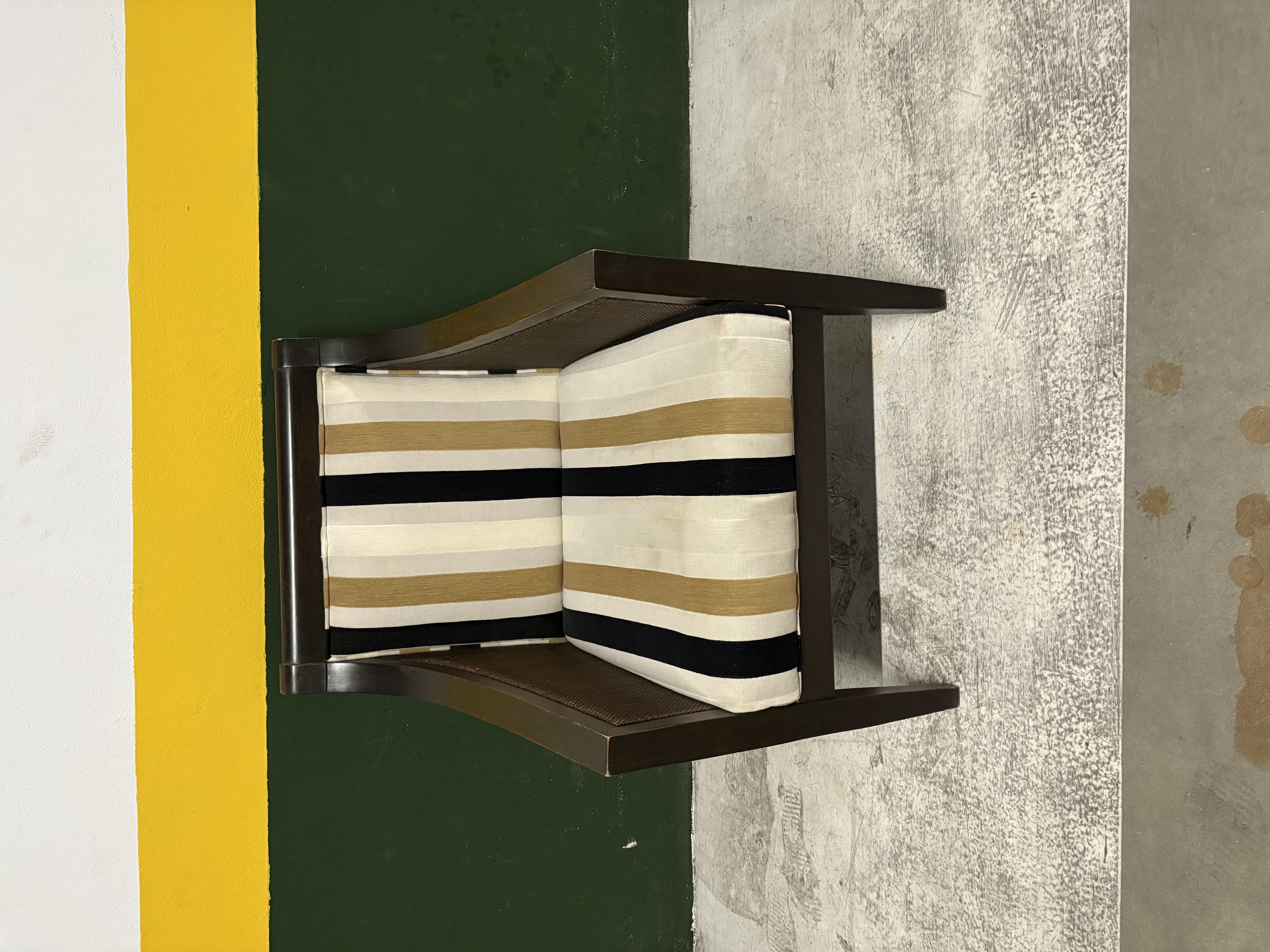 O assento e encosto apresentam tecido com padrão de riscas verticais em tons bege, castanho e preto, conferindo um ar sofisticado e contemporâneo.