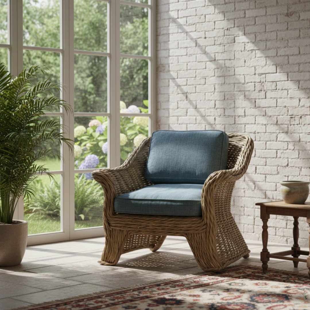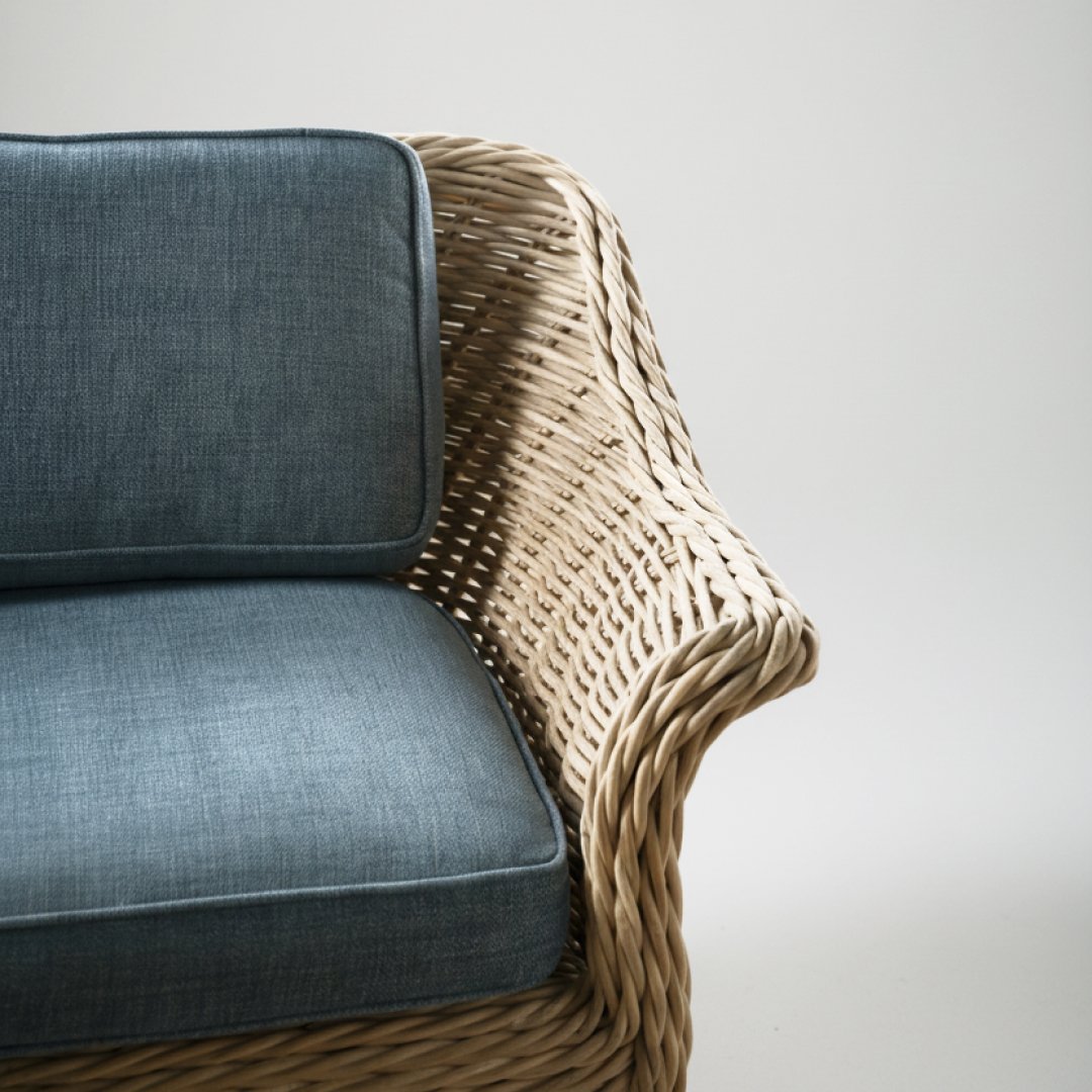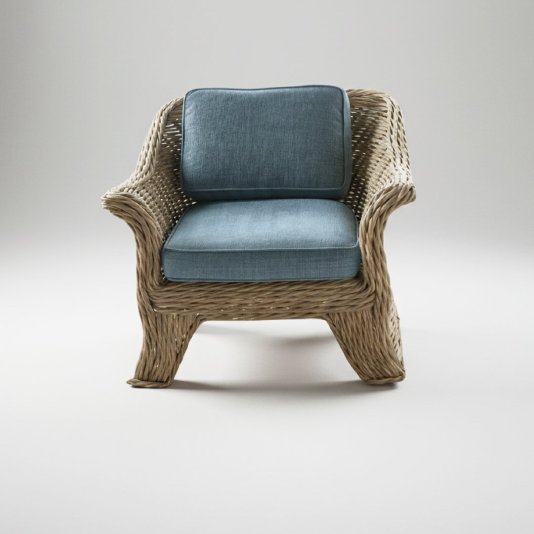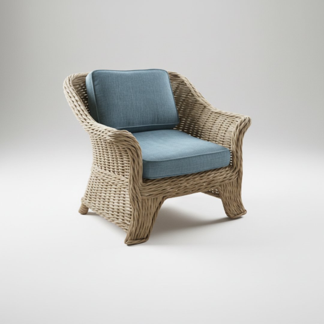 Esta poltrona de estilo "Concha" ou "Lounge" é uma peça artesanal que evoca um ambiente de relaxamento natural. O seu entrançado robusto em vime de alta qualidade cria uma estrutura envolvente e orgânica, ideal para jardins de inverno, varandas cobertas ou salas de estar que procuram um toque boho-chic. O contraste entre a textura quente da fibra natural e as almofadas em tom azul denim confere-lhe uma frescura contemporânea única.