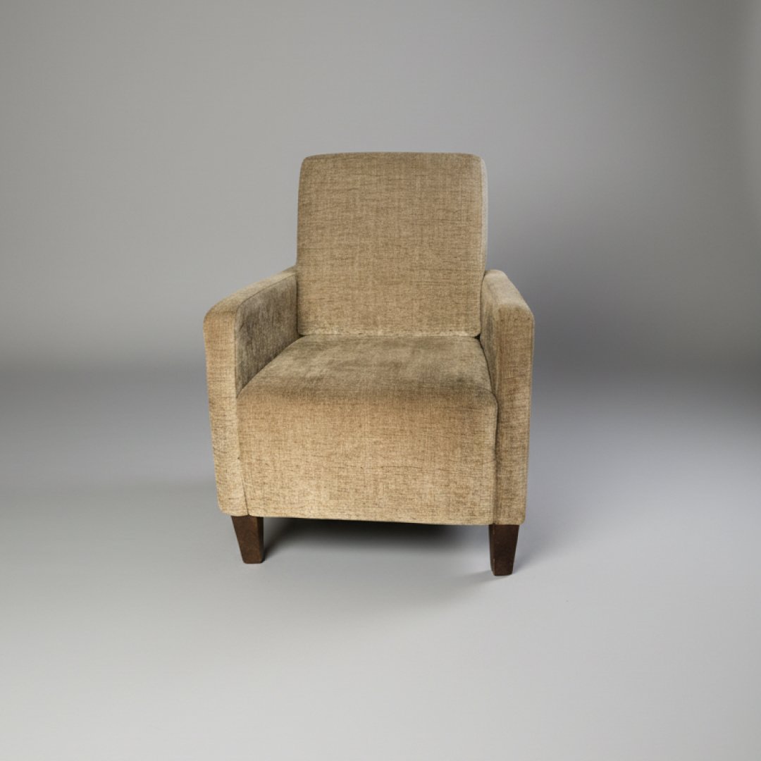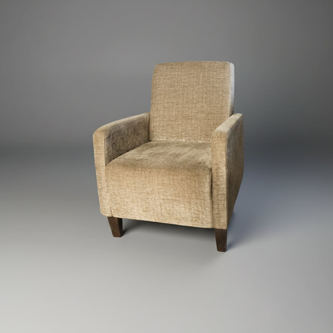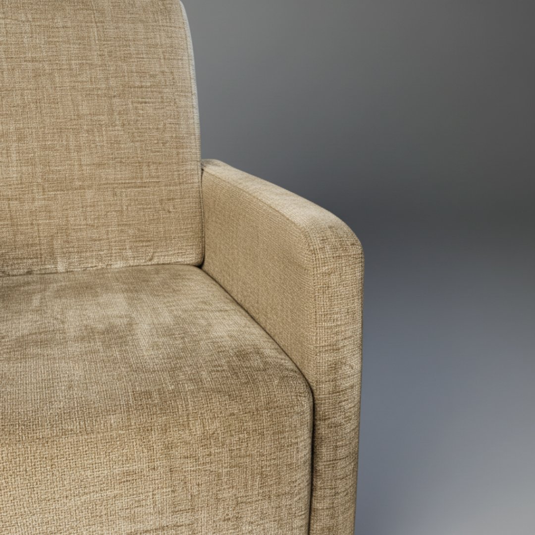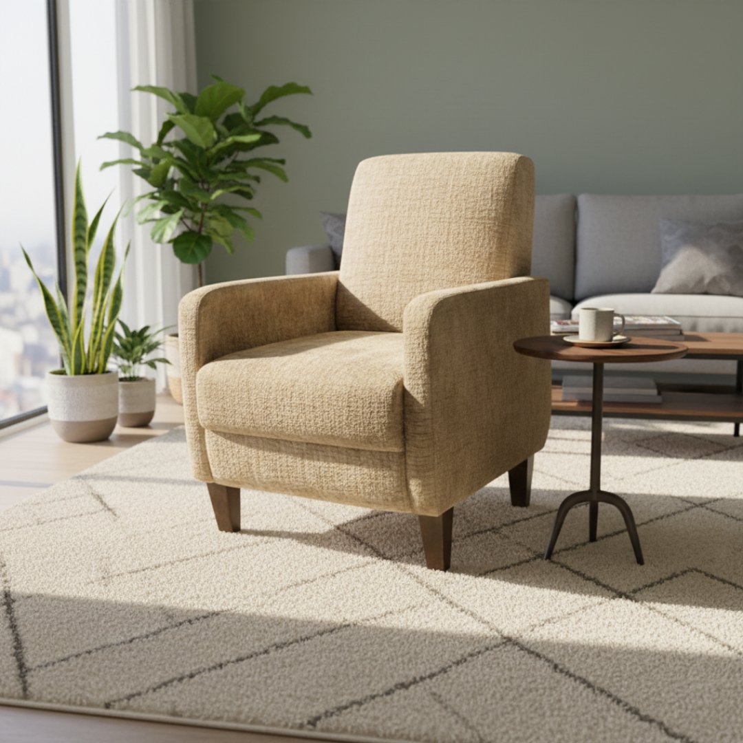 Esta poltrona apresenta um design contemporâneo de linhas direitas e perfil baixo, focada na funcionalidade e no conforto. O estofo em tecido tipo chenille bege oferece uma textura rica e resistente, sendo suportado por pés discretos em madeira escura. É uma peça versátil, ideal para integrar salas de estar, zonas de leitura ou espaços de espera com uma estética neutra.