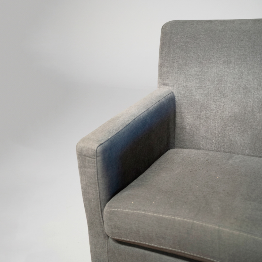 Estrutura e suspensão em bom estado. O tecido de microfibra apresenta sinais de armazenamento. Beneficia de uma higienização simples para levantar a fibra e uniformizar o tom cinza, recuperando o seu aspeto de nova.