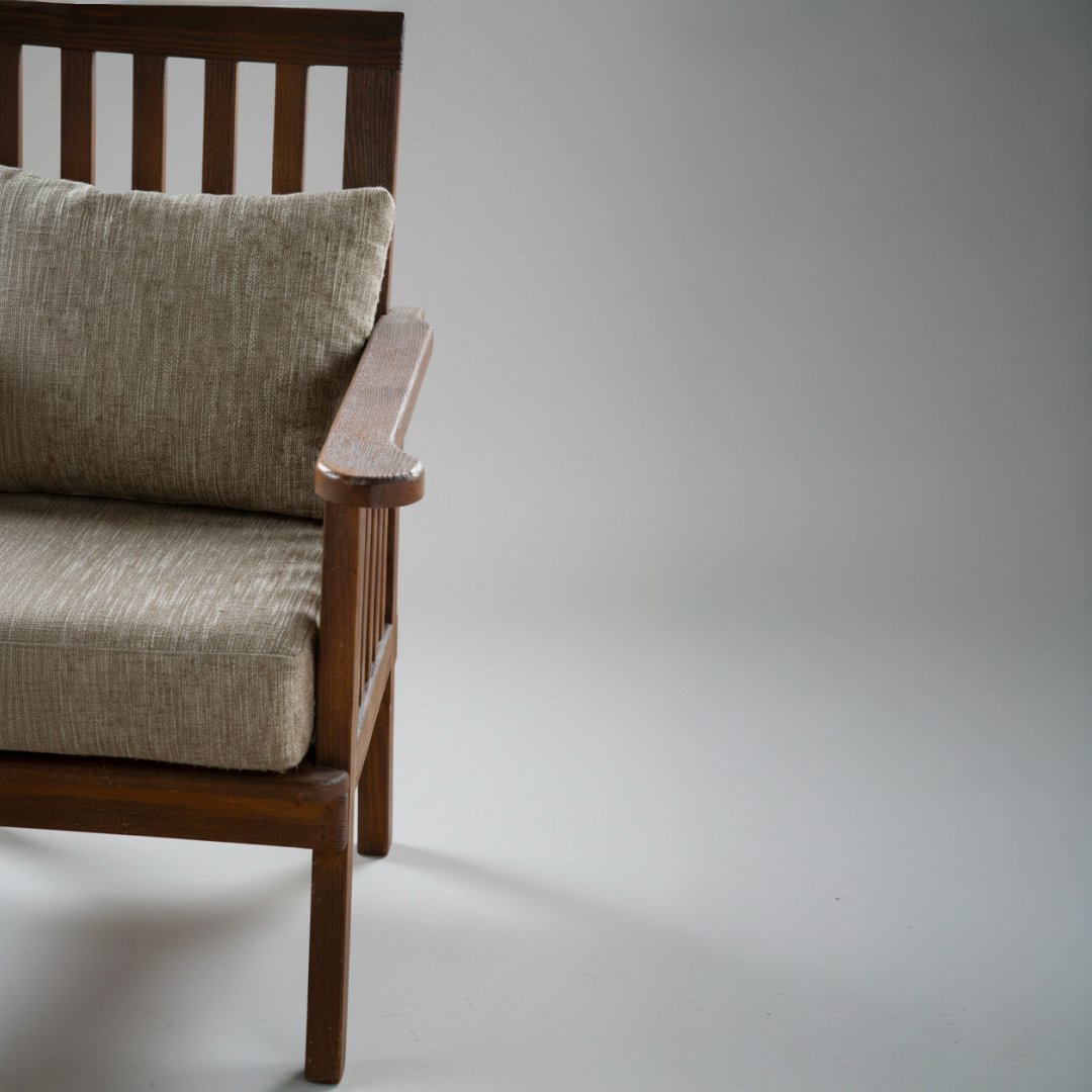 A estrutura em madeira maciça encontra-se impecável, apresentando uma estabilidade e durabilidade superior às peças modernas de consumo rápido. O tecido do assento e a almofada de encosto estão bem conservados, sem rasgos ou desgaste acentuado. Sendo um artigo proveniente de contexto profissional, beneficia de uma limpeza têxtil simples e de uma hidratação da madeira com óleo próprio para recuperar o brilho profundo do tom nogueira.