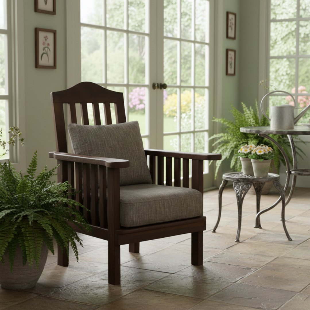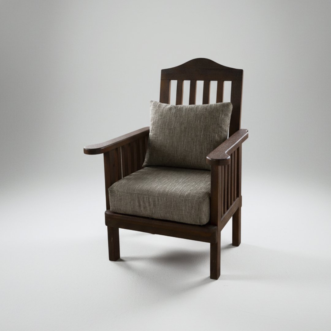 Esta poltrona é um exemplar clássico de mobiliário de hotelaria, onde a robustez da madeira escura se funde com um design de linhas tradicionais e intemporais. O encosto alto e trabalhado, juntamente com os apoios de braços largos e ergonómicos, oferece um conforto excecional. O estofo em tecido cinza mesclado confere-lhe uma sobriedade moderna, tornando-a a peça ideal para salas de estar com alma, bibliotecas particulares ou quartos de estilo rústico-chic.
