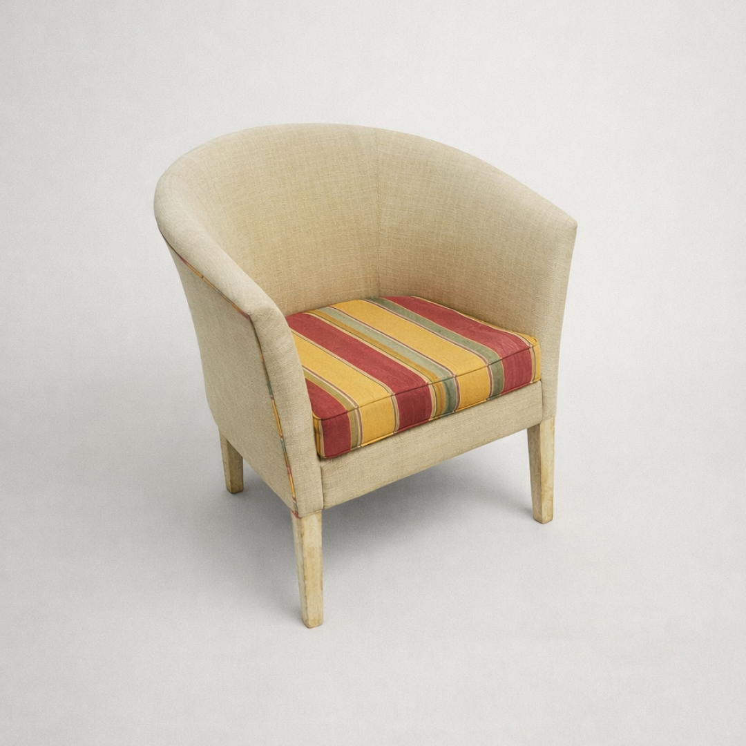 Está em bom estado estrutural, com sinais normais de uso no tecido do assento. Pode beneficiar de limpeza ou reestofamento, dependendo do projeto.