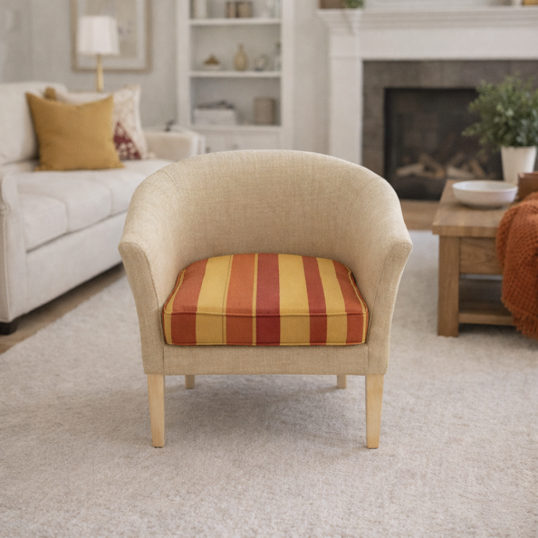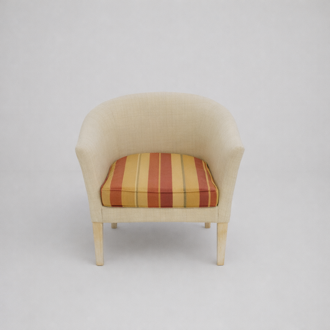 O revestimento exterior em tecido texturizado verde oliva harmoniza com uma almofada de assento removível em padrão listrado. Apresenta uma integridade estrutural excelente, com sinais normais de uso no tecido do assento.