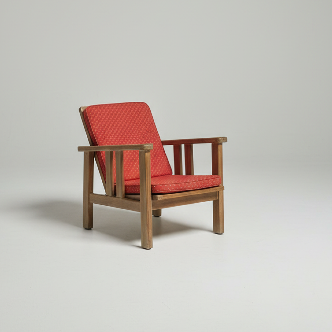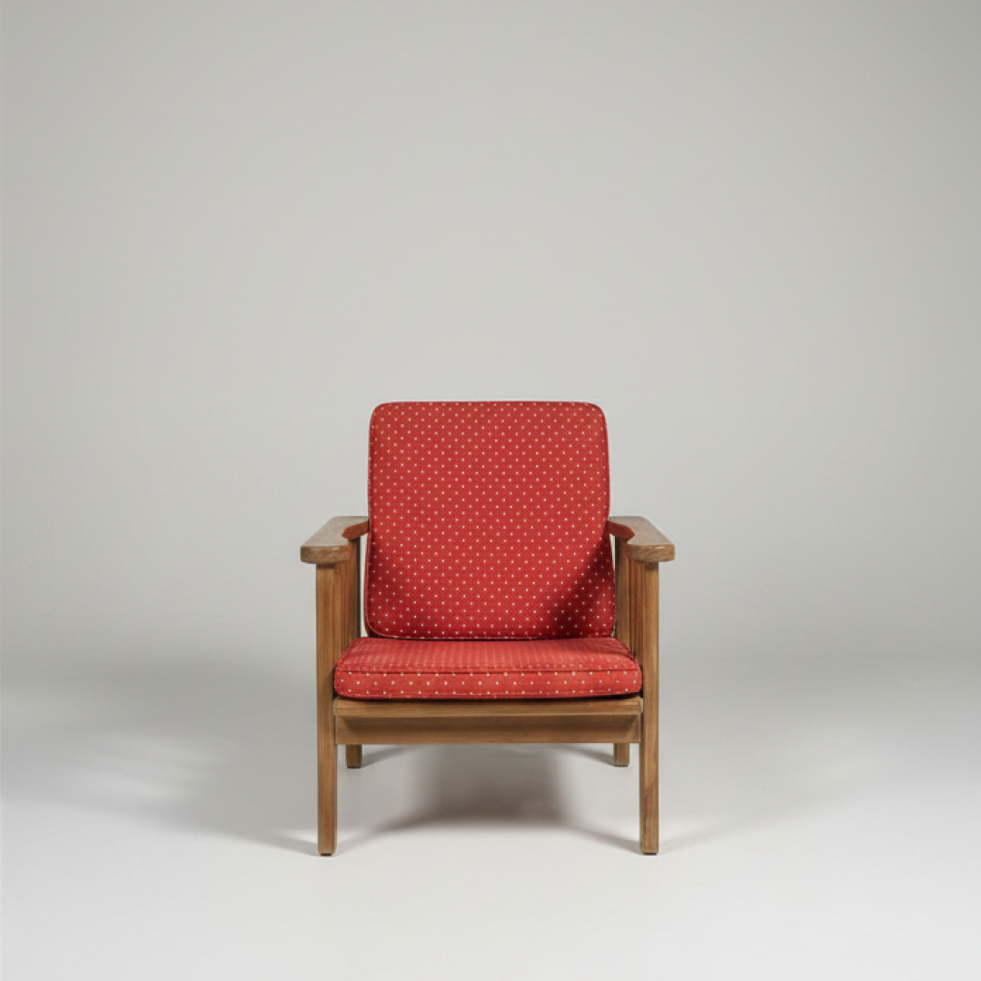 Uma peça de design clássico e robusto, esta poltrona combina o calor da madeira natural com um estofo vibrante em tons de vermelho e padrão subtil. Com apoios de braços largos e uma estrutura sólida, é perfeita para criar um canto de leitura acolhedor ou complementar uma sala de estar com um toque de cor.