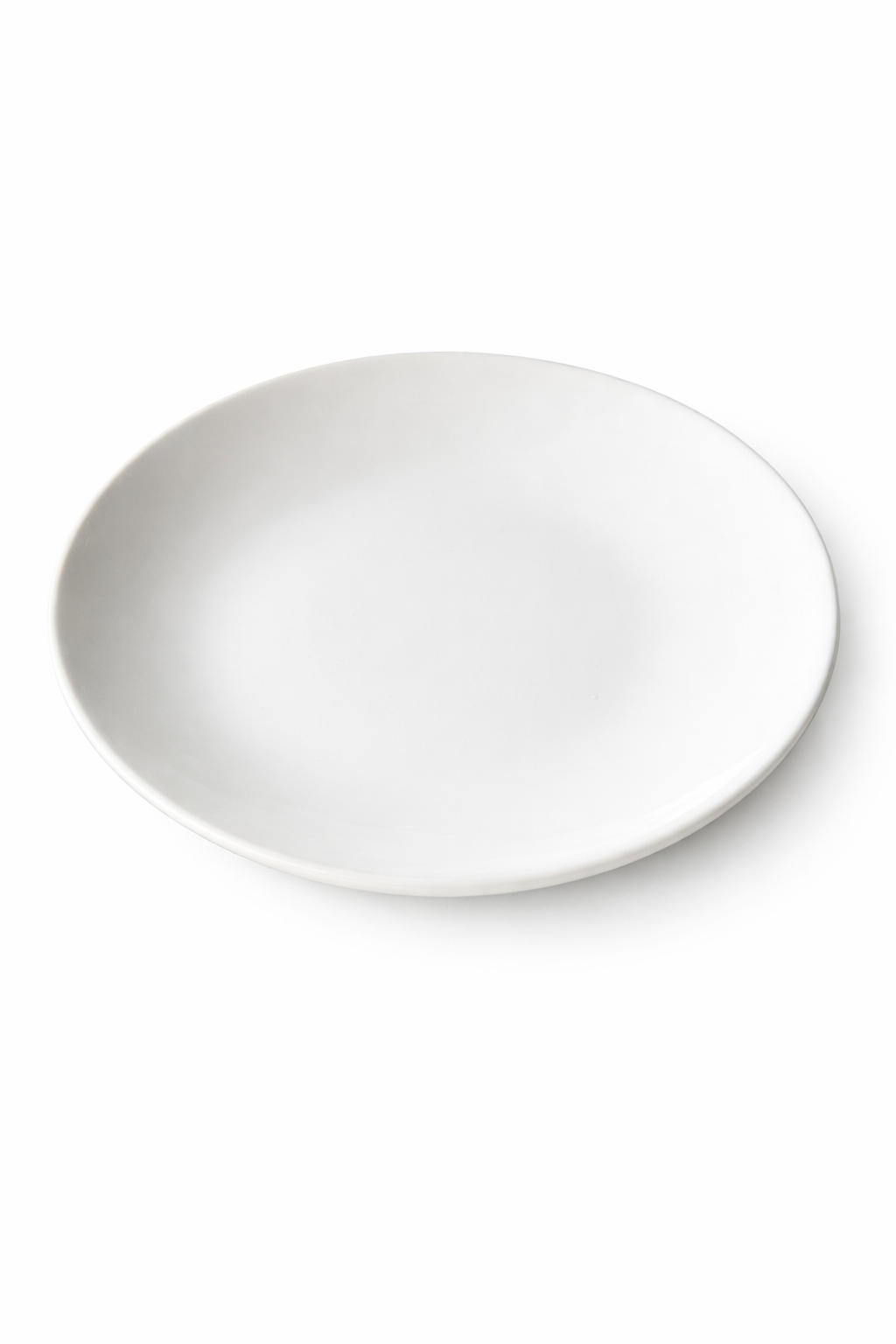 Prato de sobremesa raso em cerâmica branca, de linhas simples e acabamento liso.