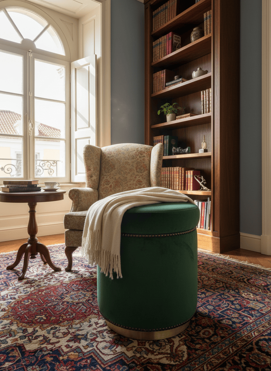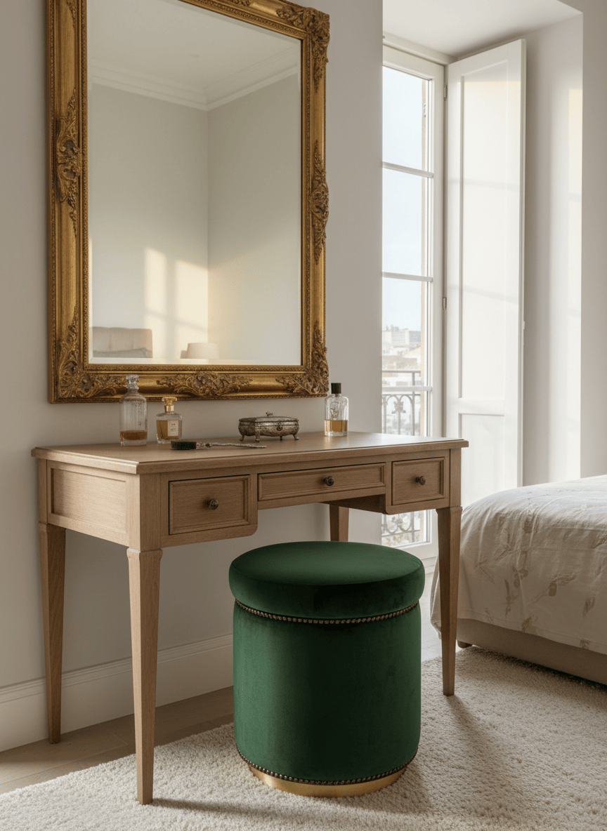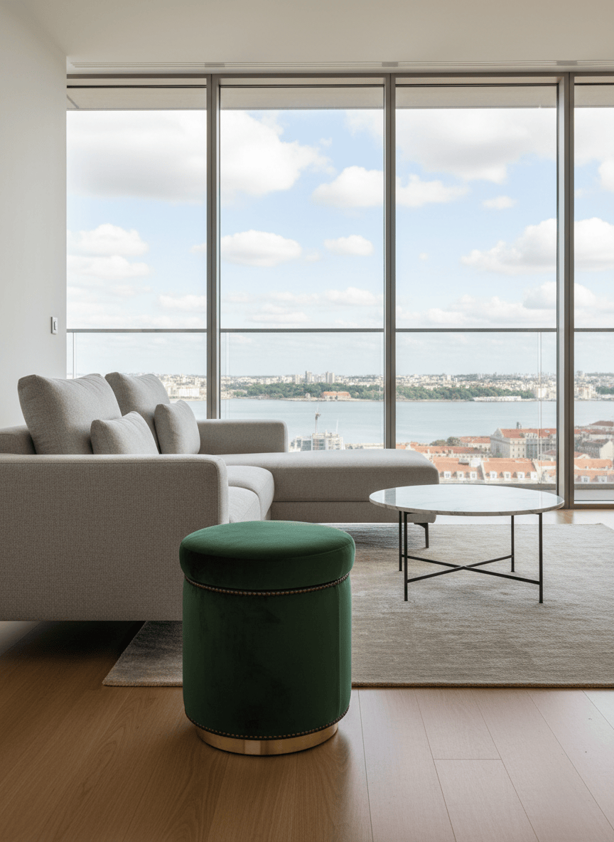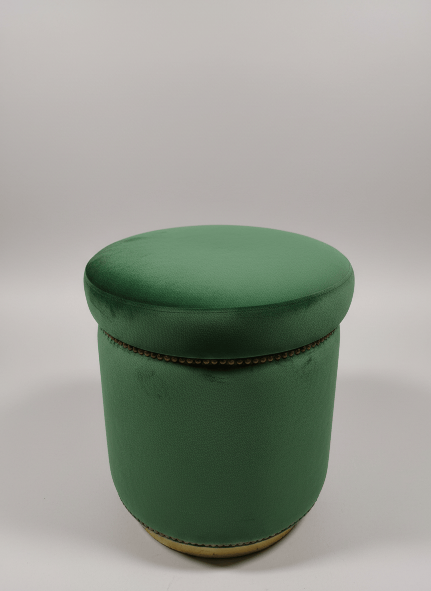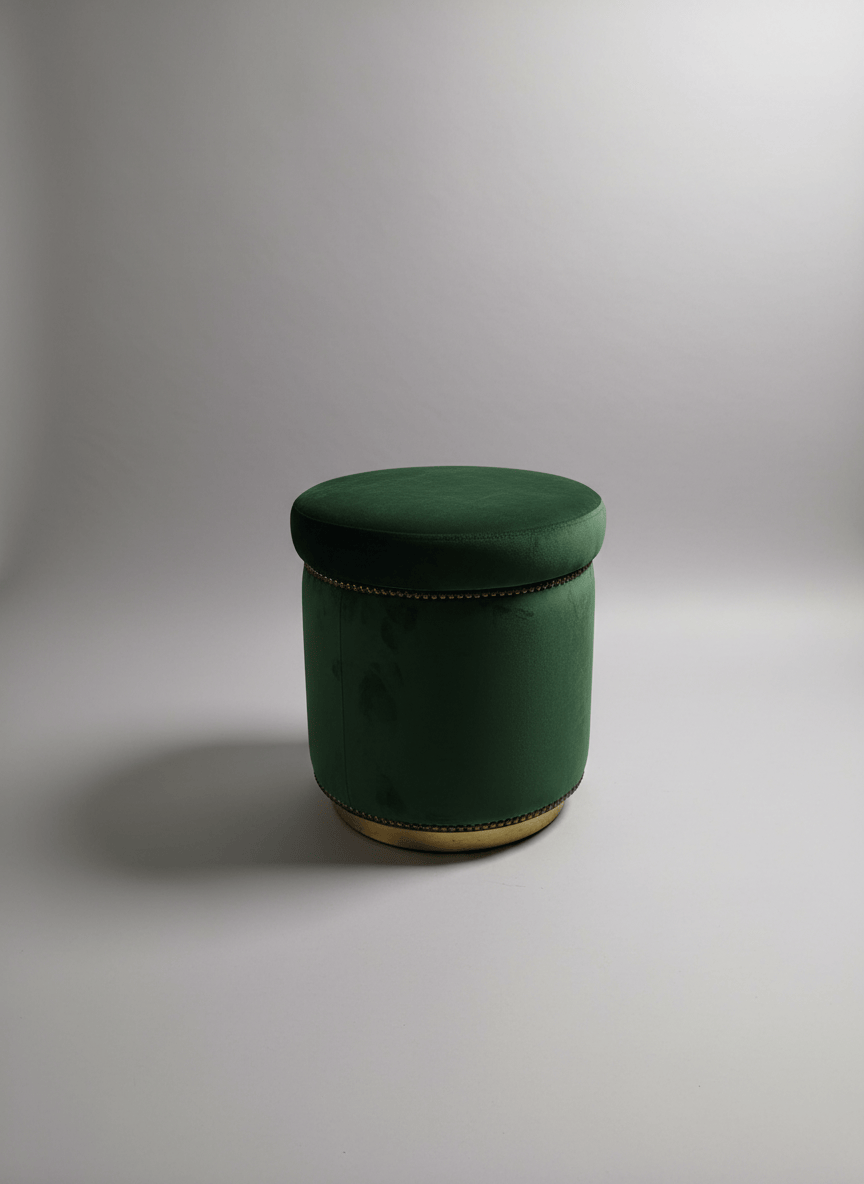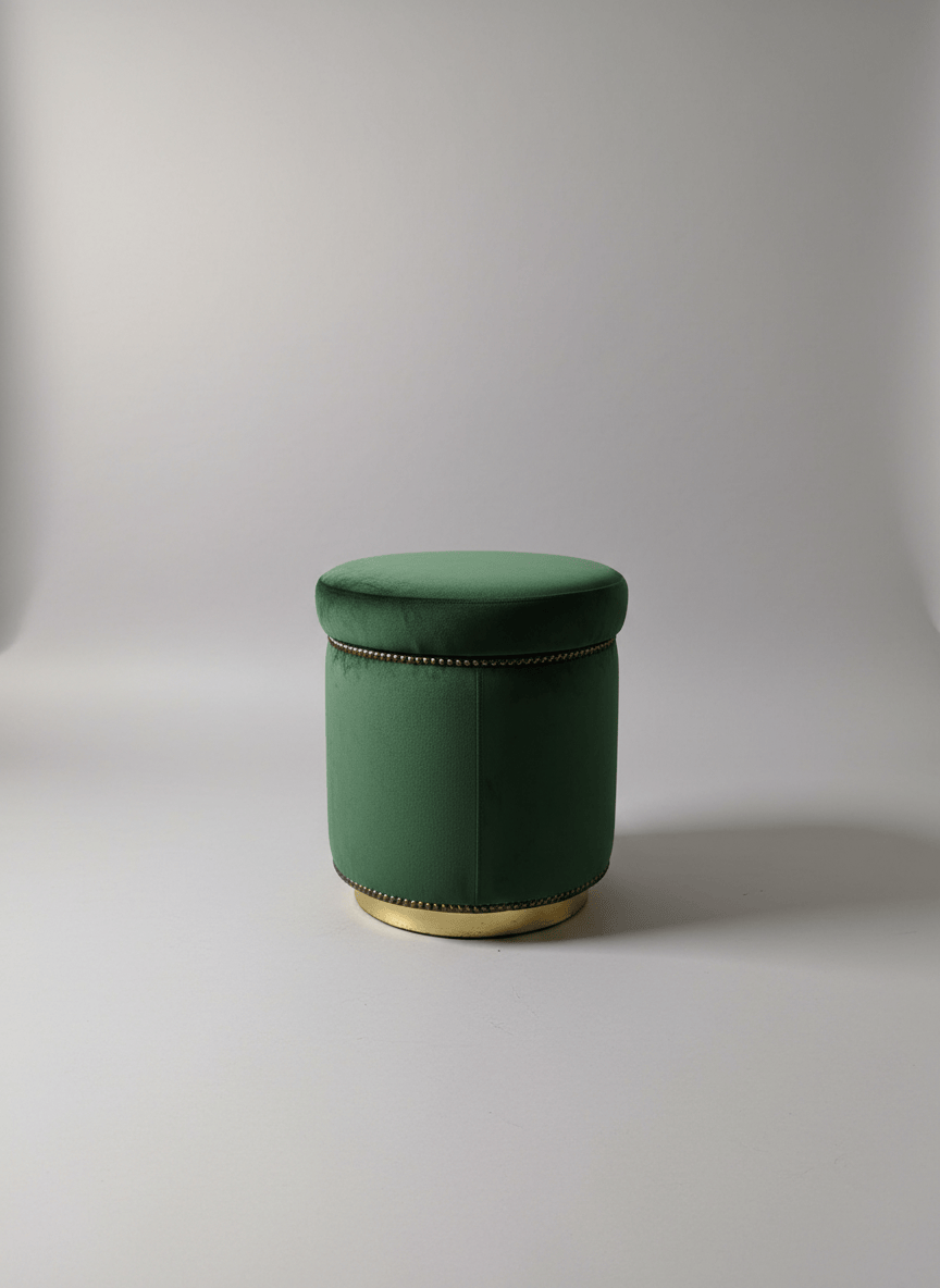 Pufe redondo estofado em veludo verde, com acabamento em metal dourado na base. Peça versátil, ideal como assento extra, apoio para os pés ou elemento decorativo em quartos, salas ou espaços comerciais.