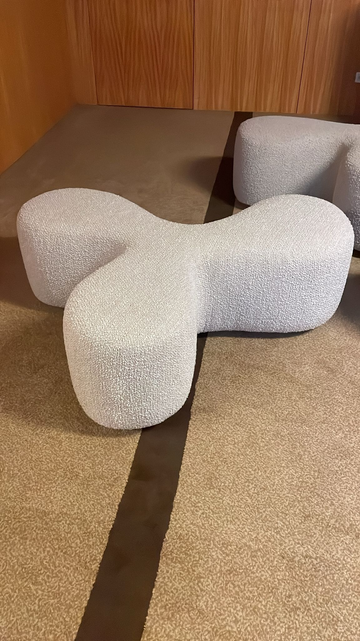Puff de design contemporâneo com forma orgânica em “Y”, estofado em tecido bouclé branco. Uma peça escultural e versátil que funciona tanto como assento quanto como elemento decorativo, ideal para zonas lounge, receções ou espaços criativos.