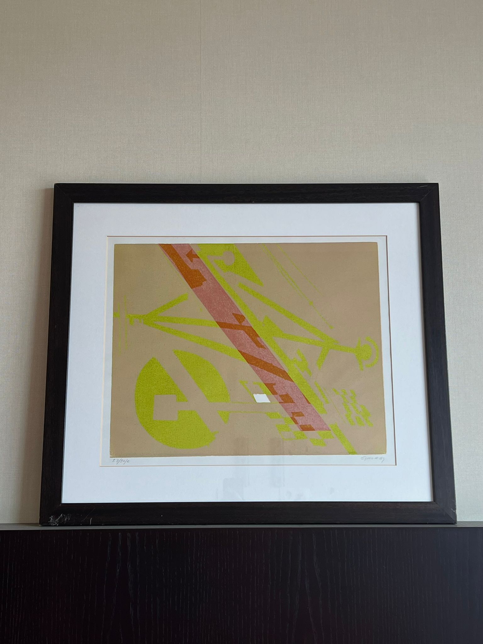 Quadro abstrato decorativo com composição geométrica em tons de bege, verde e apontamentos de laranja. Enquadrado com moldura escura e passe-partout claro, ideal para ambientes modernos ou contemporâneos.