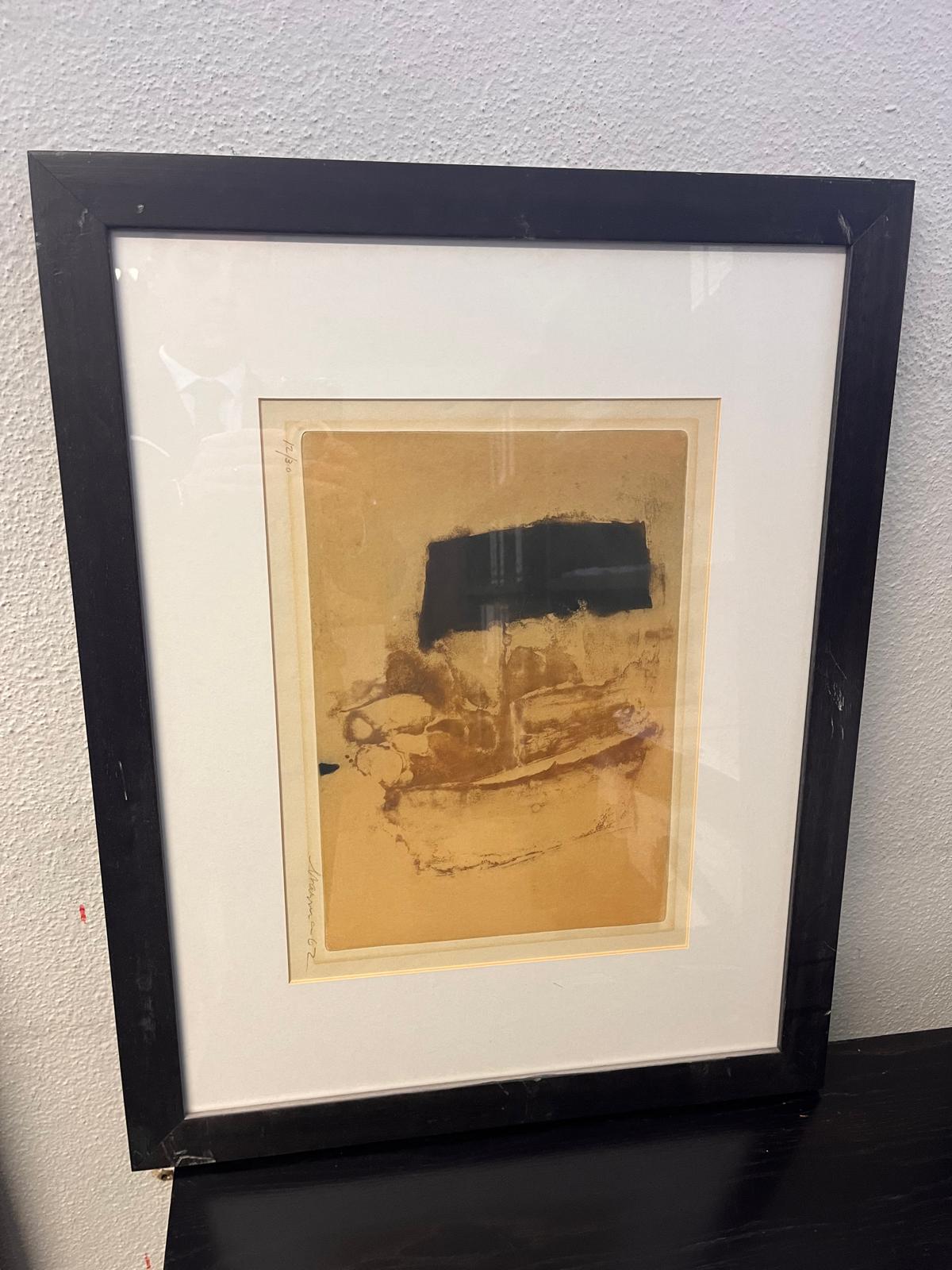 Quadro abstrato decorativo com composição geométrica em tons de amarelo e preto. Enquadrado com moldura escura e passe-partout claro, ideal para ambientes modernos ou contemporâneos.