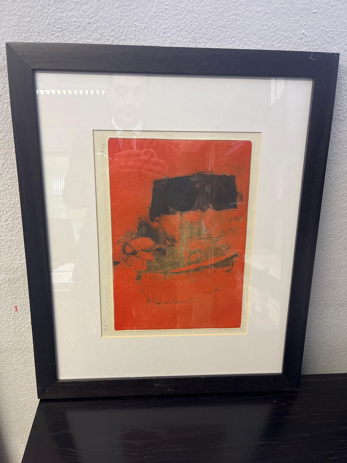 Quadro abstrato decorativo com composição geométrica em tons de laranja e preto. Enquadrado com moldura escura e passe-partout claro, ideal para ambientes modernos ou contemporâneos.