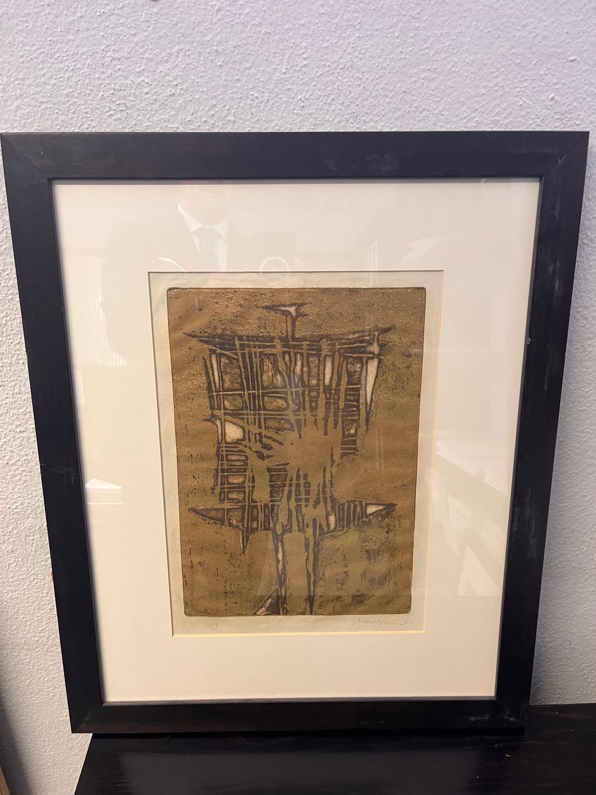 Quadro abstrato decorativo com composição geométrica em tons de castanho e dourado. Enquadrado com moldura escura e passe-partout claro, ideal para ambientes modernos ou contemporâneos.
