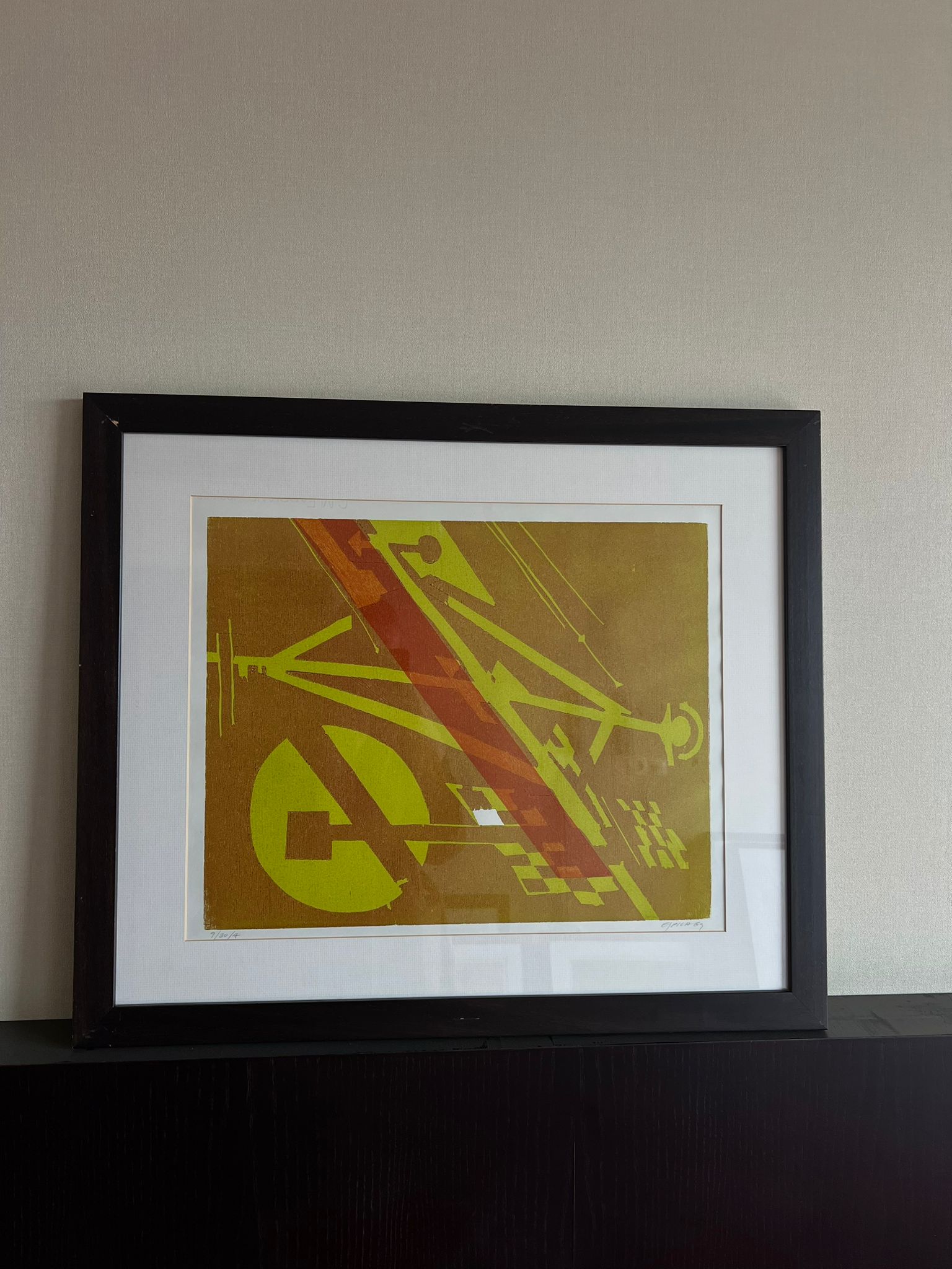 Quadro abstrato decorativo em tons castanho e verde, com composição gráfica marcante e estilo contemporâneo. Emoldurado com moldura escura e passe-partout claro, ideal para dar destaque a espaços modernos.