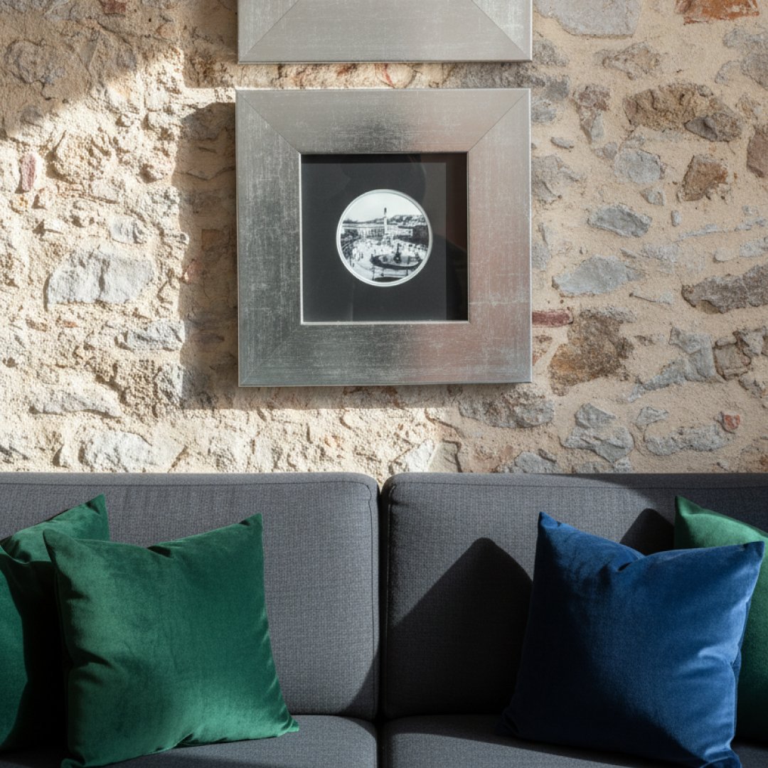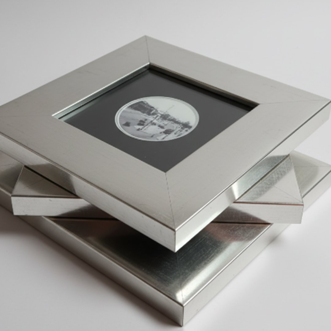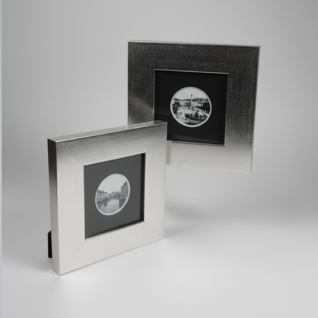 Quadros decorativos de formato quadrado com molduras largas em tom prateado. Cada peça apresenta uma fotografia central circular em tons de sépia/preto e branco, capturando cenários urbanos clássicos. O design elegante e o contraste entre a moldura metálica e o fundo escuro conferem uma estética sofisticada a qualquer parede.