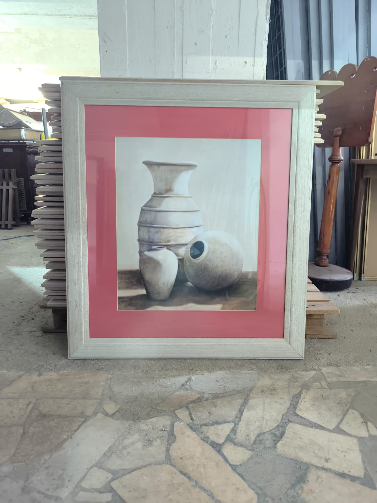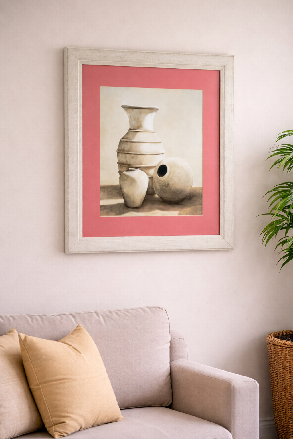 Quadro decorativo com moldura em madeira clara e passe-partout em tom rosa. Ilustração de vasos em tons neutros, ideal para sala, quarto ou hall.