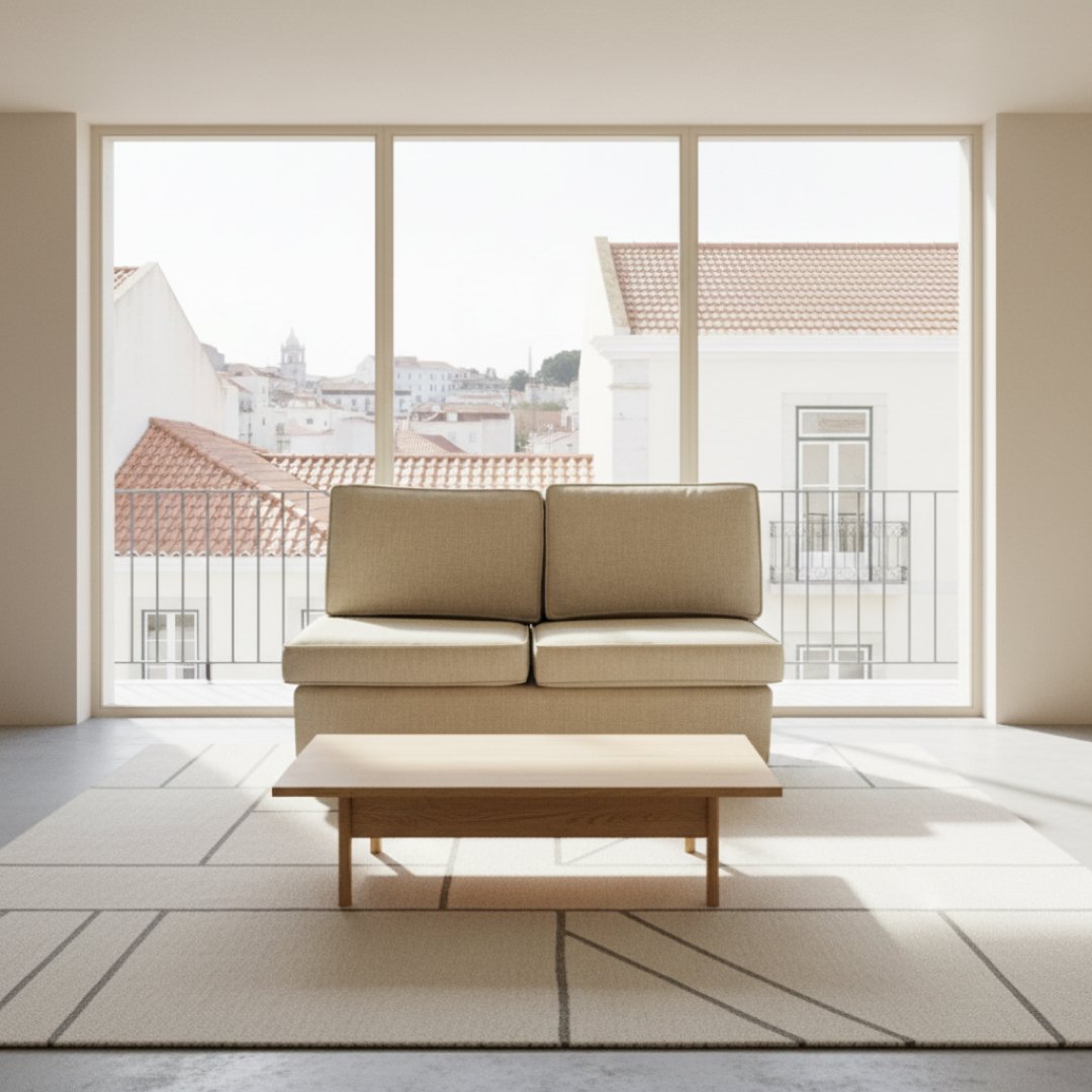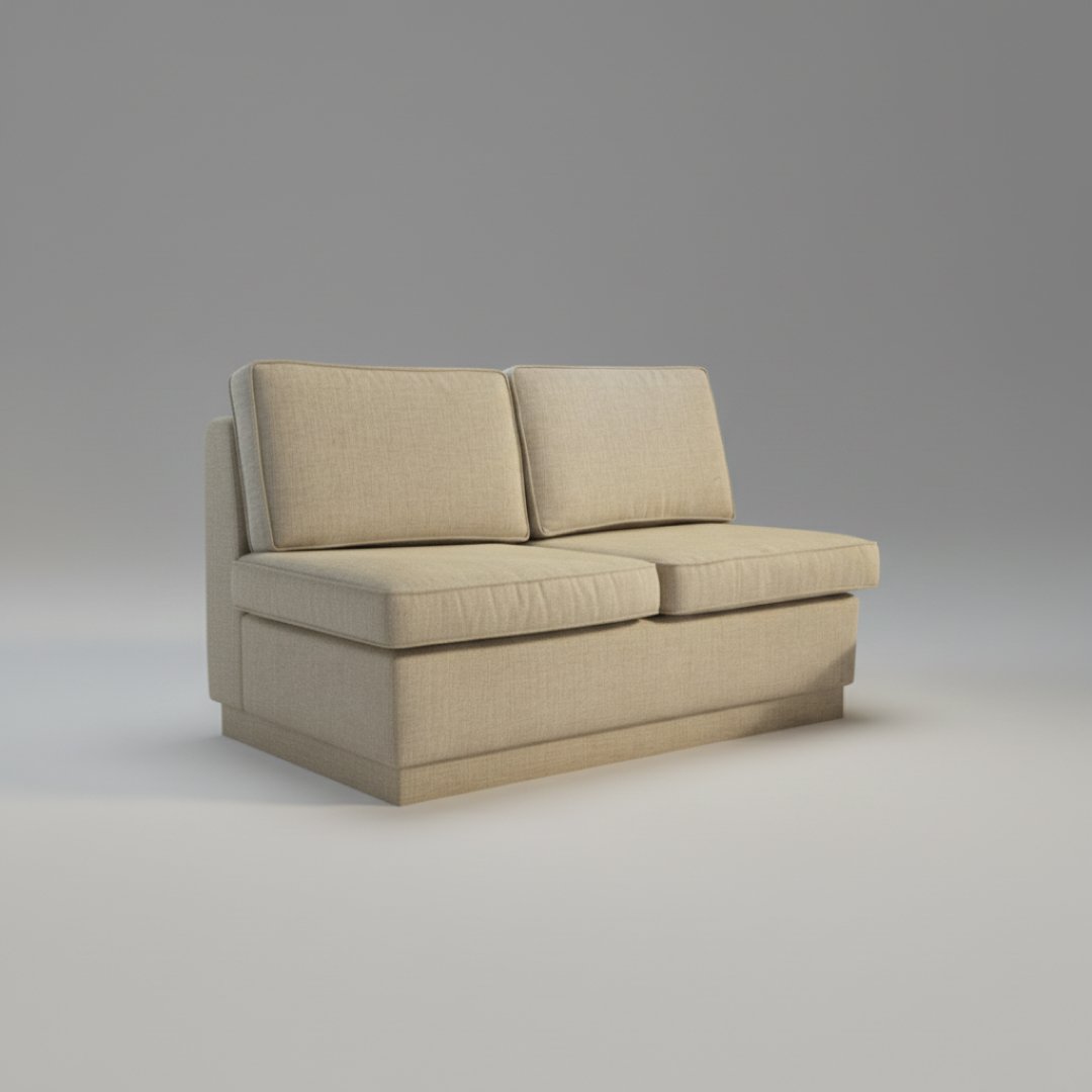 Este sofá de dois lugares apresenta um design funcional e compacto, ideal para salas de estar pequenas, quartos ou áreas de receção. O estofo em tecido bege neutro com textura rústica é composto por almofadas de assento e encosto individuais, proporcionando um suporte estruturado e confortável. A base fechada e as linhas retas conferem-lhe uma estética intemporal e versátil.