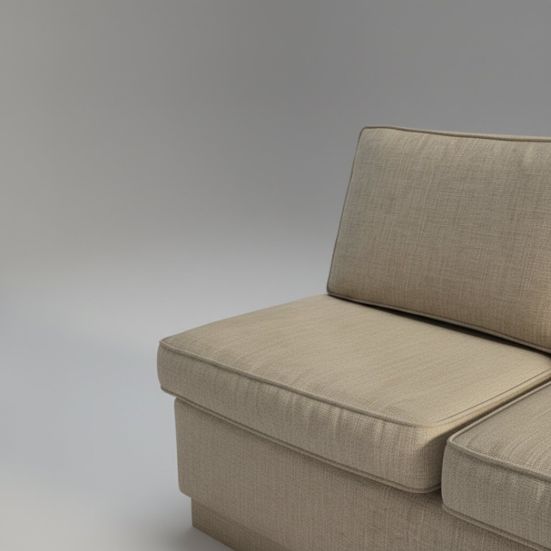 A estrutura interna e a base encontram-se sólidas. O estofo apresenta marcas de armazenamento, incluindo sombras superficiais de pó e vincos no tecido resultantes do acondicionamento em armazém. Uma limpeza têxtil simples uniformiza o tom bege e revitaliza a textura, removendo as marcas de logística e preparando a peça para uso imediato.
