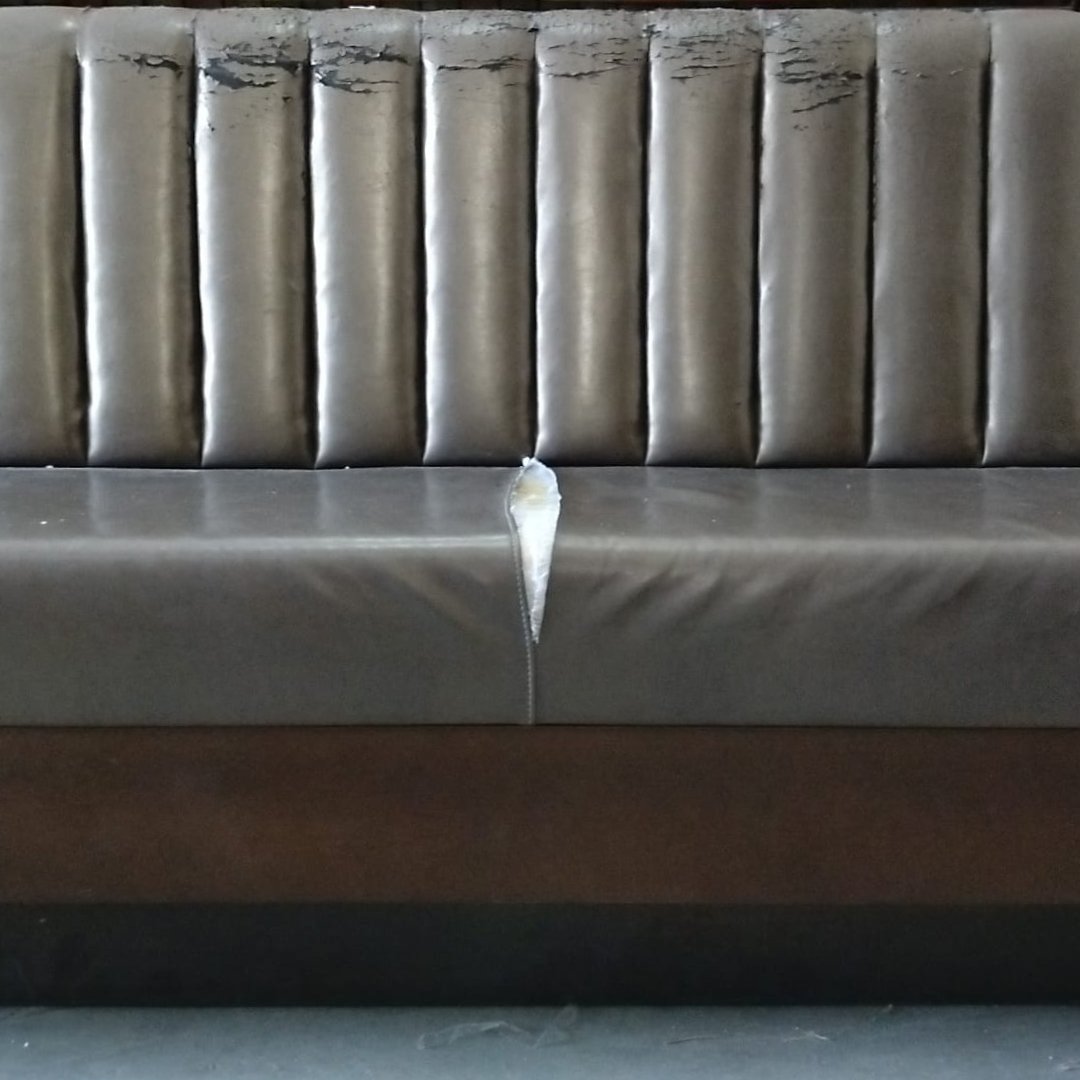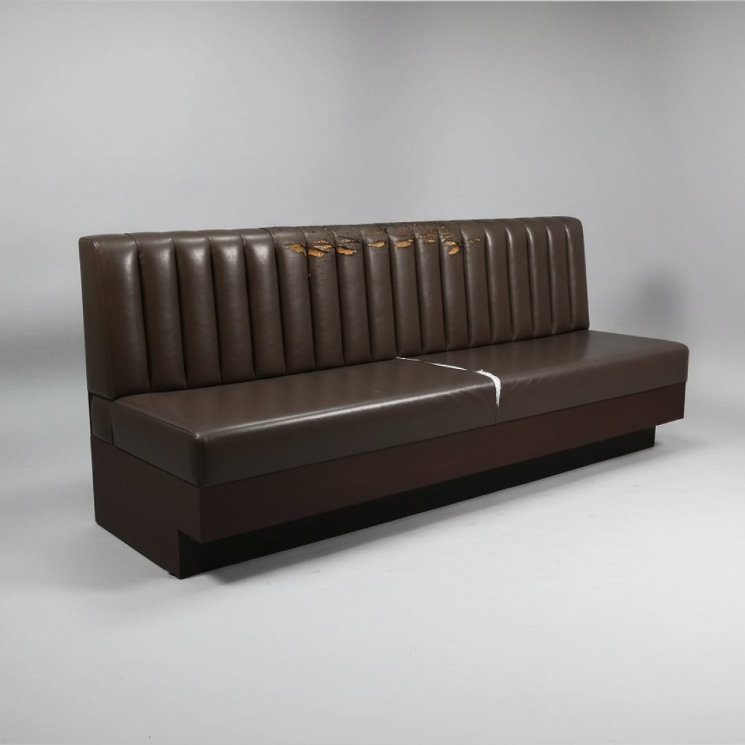 Este artigo é um sofá de três lugares com design inspirado em mobiliário de restauração (estilo hamburgueria ou diner). Apresenta um encosto alto com gomos verticais e uma estrutura robusta com as costas em madeira de tom escuro. O revestimento é em material sintético de tom castanho metalizado. Trata-se de uma peça em segunda mão que apresenta danos significativos no revestimento, com o material visivelmente descascado e rasgado na zona superior do encosto e marcas de uso acentuadas no assento. A estrutura de madeira e o suporte geral mantêm-se sólidos. Devido ao estado do revestimento, é um artigo ideal para estofar, permitindo uma renovação total para um novo projeto.