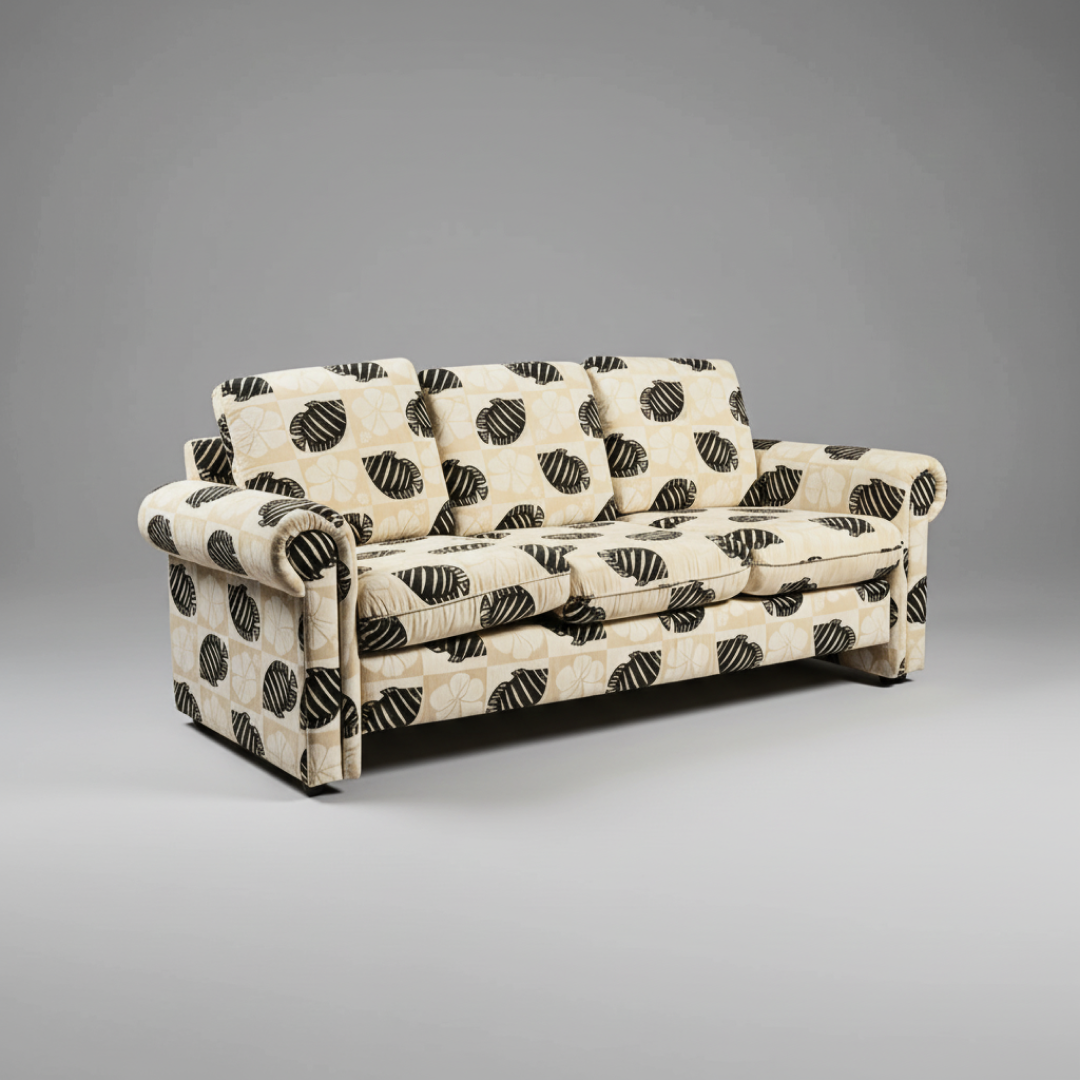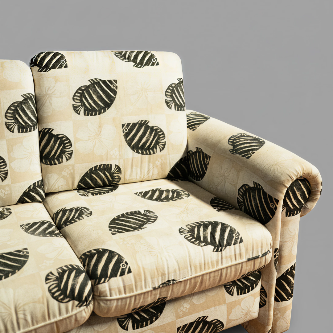 Este sofá de três lugares destaca-se pelo seu design clássico e pelo estofo com um padrão figurativo de peixes, criando uma estética temática e lúdica. Apresenta braços arredondados e almofadas de encosto e assento generosas, oferecendo um conforto envolvente. É uma peça de acento ideal para casas de férias, zonas de lazer ou ambientes que procurem um toque de originalidade e descontração.