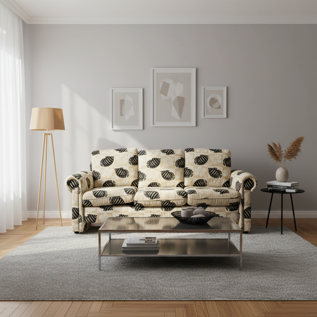 A estrutura interna e o enchimento encontram-se em bom estado, mantendo o suporte adequado. O estofo apresenta marcas de armazenamento, incluindo sombras superficiais de pó e vincos no tecido resultantes do acondicionamento em armazém. Uma limpeza têxtil simples uniformiza as cores do padrão e revitaliza a textura, removendo as marcas de logística e preparando a peça para uso imediato.