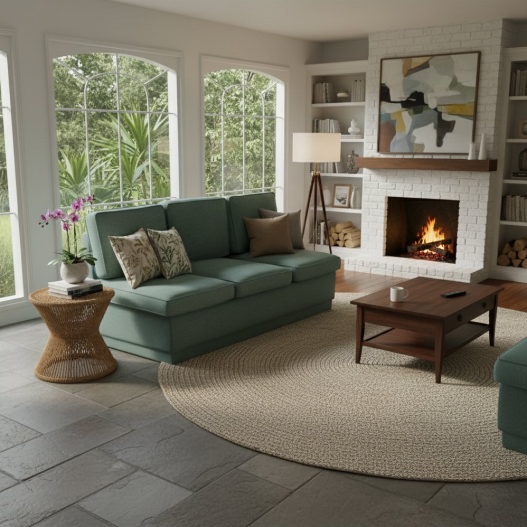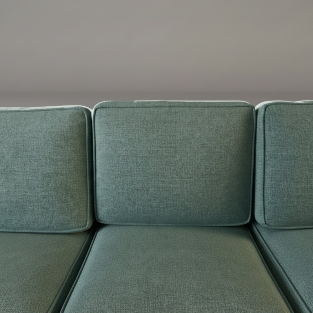 A estrutura interna e a base encontram-se sólidas. O estofo apresenta marcas de armazenamento, incluindo sombras superficiais de pó e marcas de pressão no tecido resultantes do acondicionamento em armazém. Uma limpeza têxtil simples uniformiza o tom verde e revitaliza a textura do tecido, removendo as marcas de logística e preparando a peça para uso imediato.