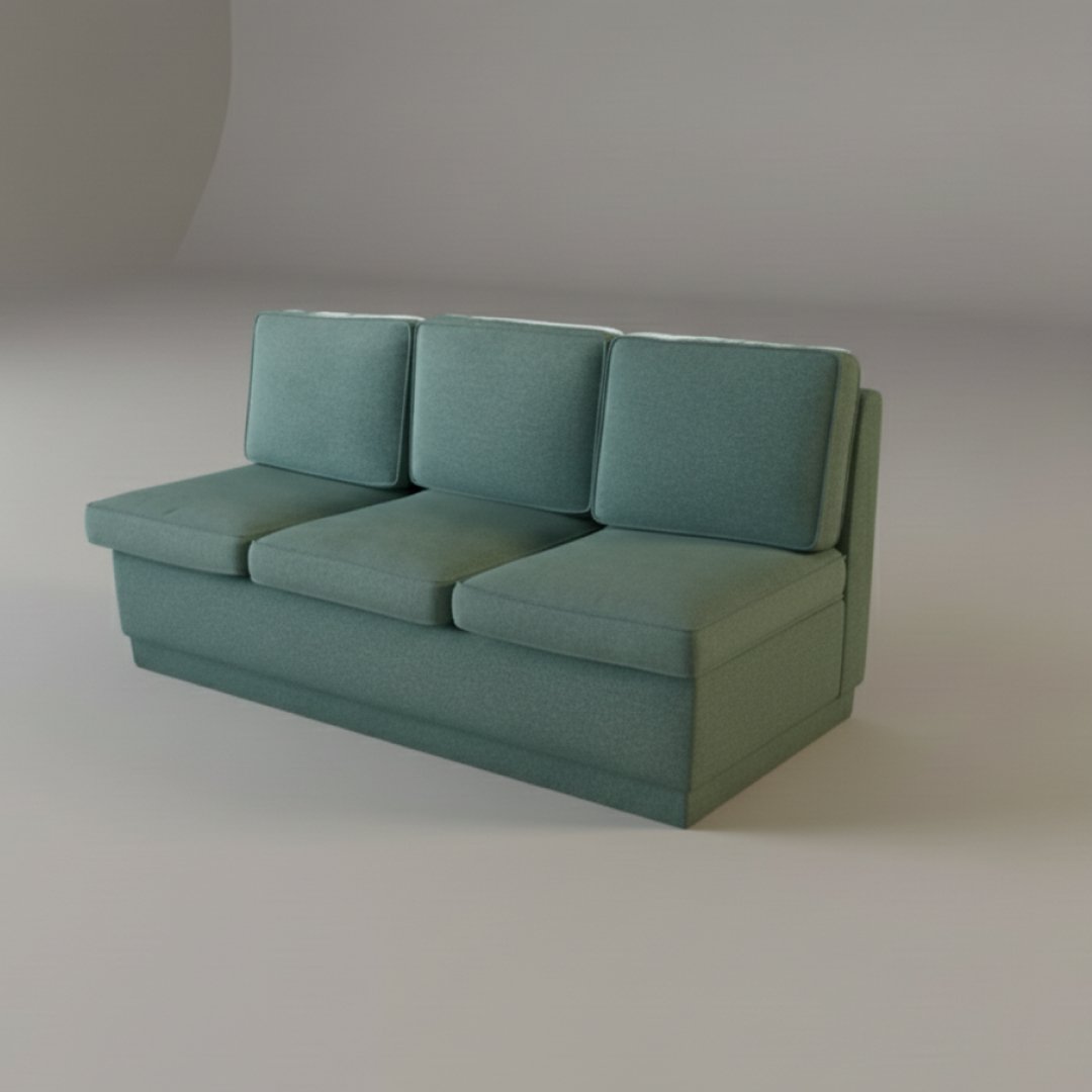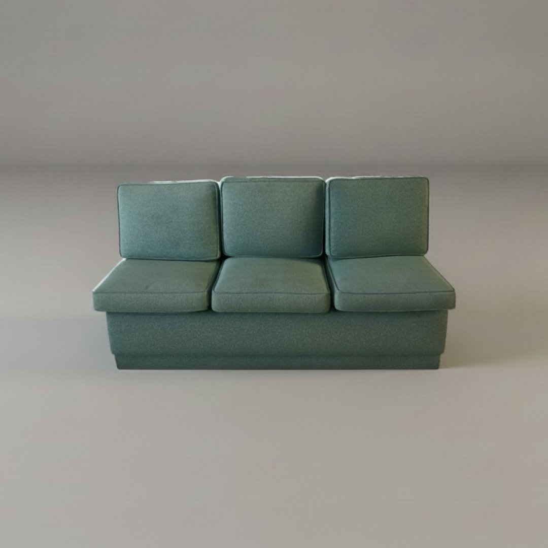 Este sofá de três lugares apresenta um design funcional e compacto, ideal para otimização de espaço em salas de estar ou áreas de espera. O estofo em tecido verde texturizado é composto por almofadas de assento e encosto individuais, oferecendo um suporte estruturado. A base fechada e as linhas retas conferem-lhe um aspeto sólido e intemporal que se adapta facilmente a diferentes contextos decorativos.