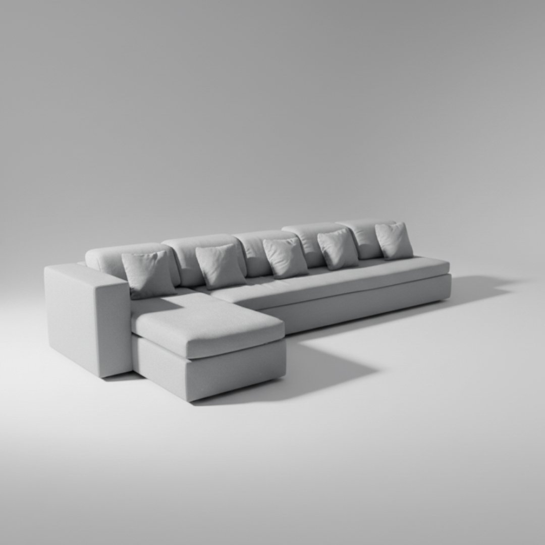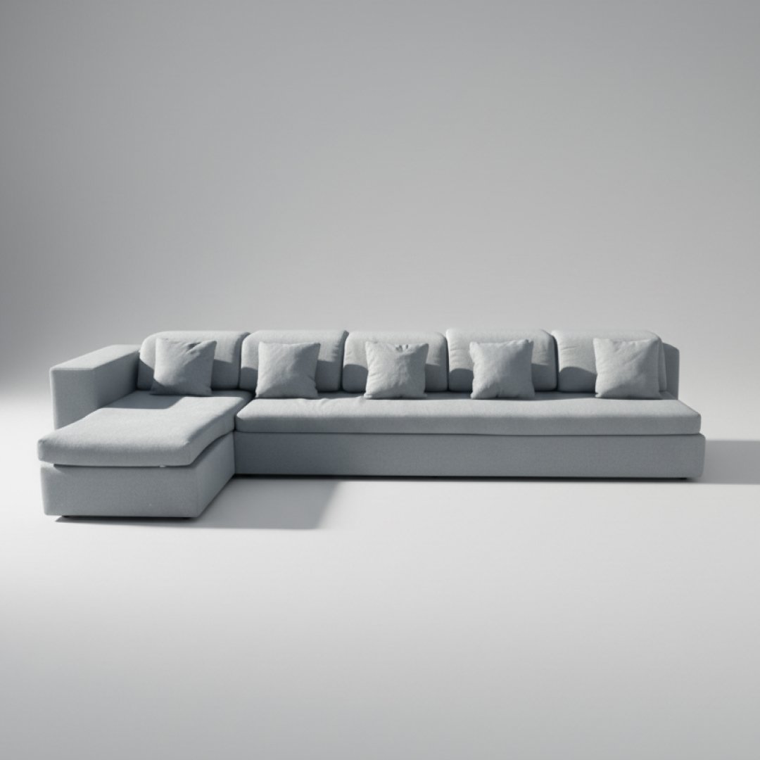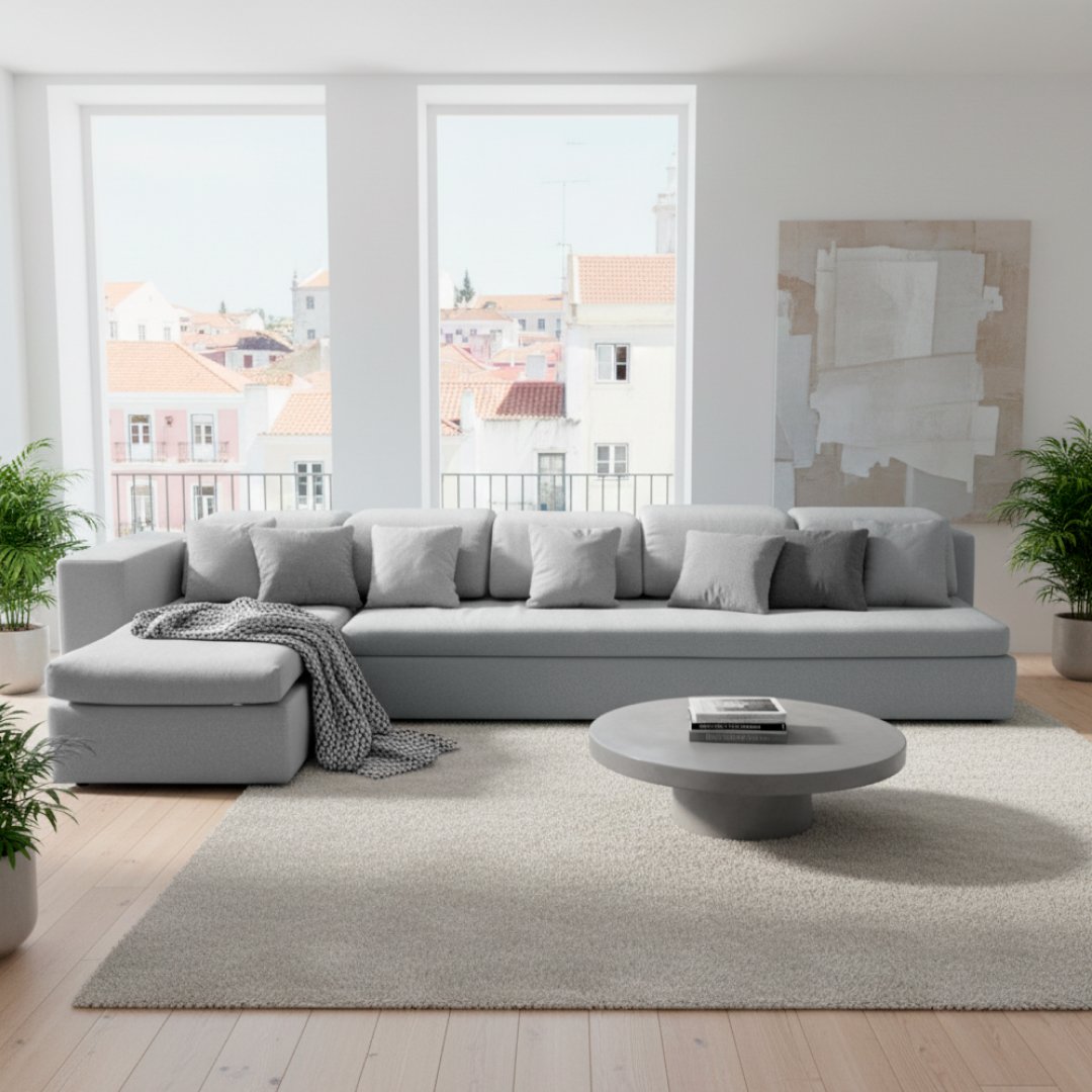 Este sofá de grandes dimensões combina um módulo principal de quatro lugares com uma chaise-longue integrada, oferecendo o máximo conforto e amplitude para salas de estar espaçosas. O design é marcado por linhas contemporâneas e um perfil baixo, estofado num tecido cinza claro mesclado de alta resistência. Inclui cinco almofadas decorativas que proporcionam um suporte lombar personalizado, tornando-o a peça central perfeita para convívio ou relaxamento total.