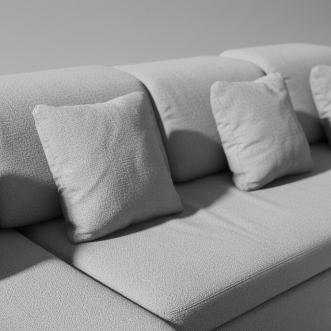 A estrutura interna e os sistemas de união dos módulos encontram-se sólidos. O estofo apresenta sinais de armazenamento, nomeadamente sombras superficiais de pó e vincos/marcas de pressão no tecido resultantes do acondicionamento em armazém. Uma limpeza têxtil simples ou aspiração profunda uniformiza o tom cinza e revitaliza a textura, eliminando as marcas de logística e deixando a peça impecável.