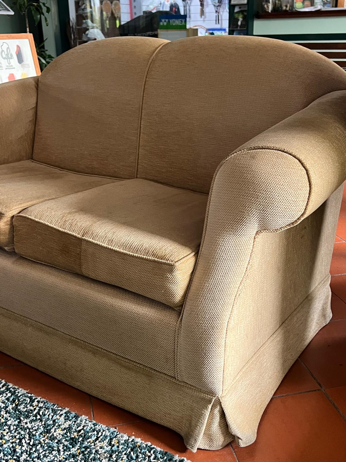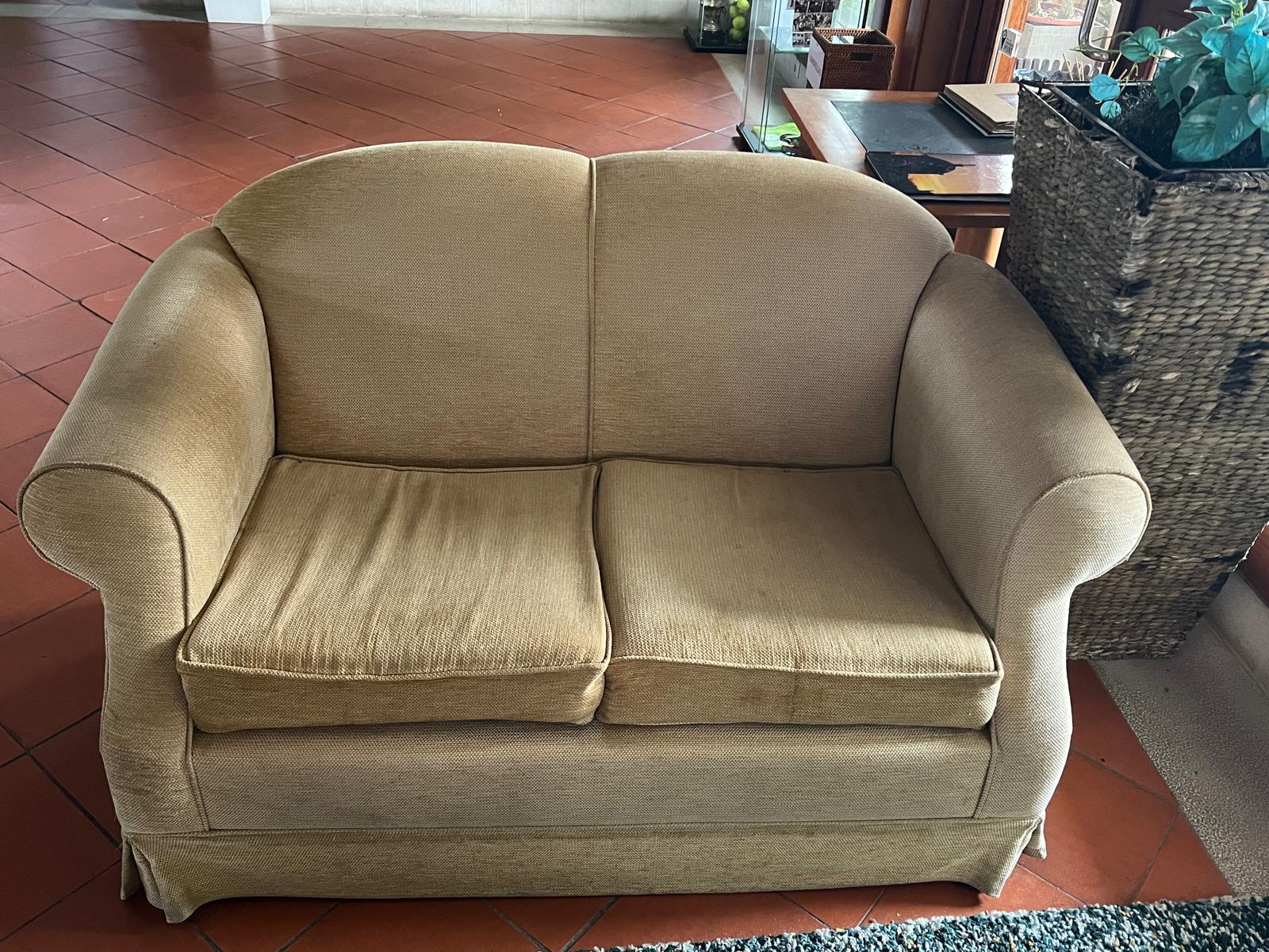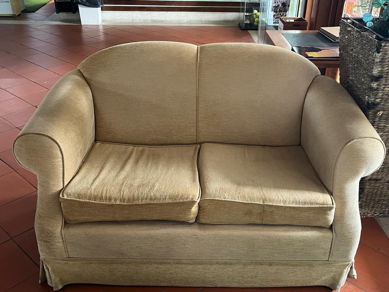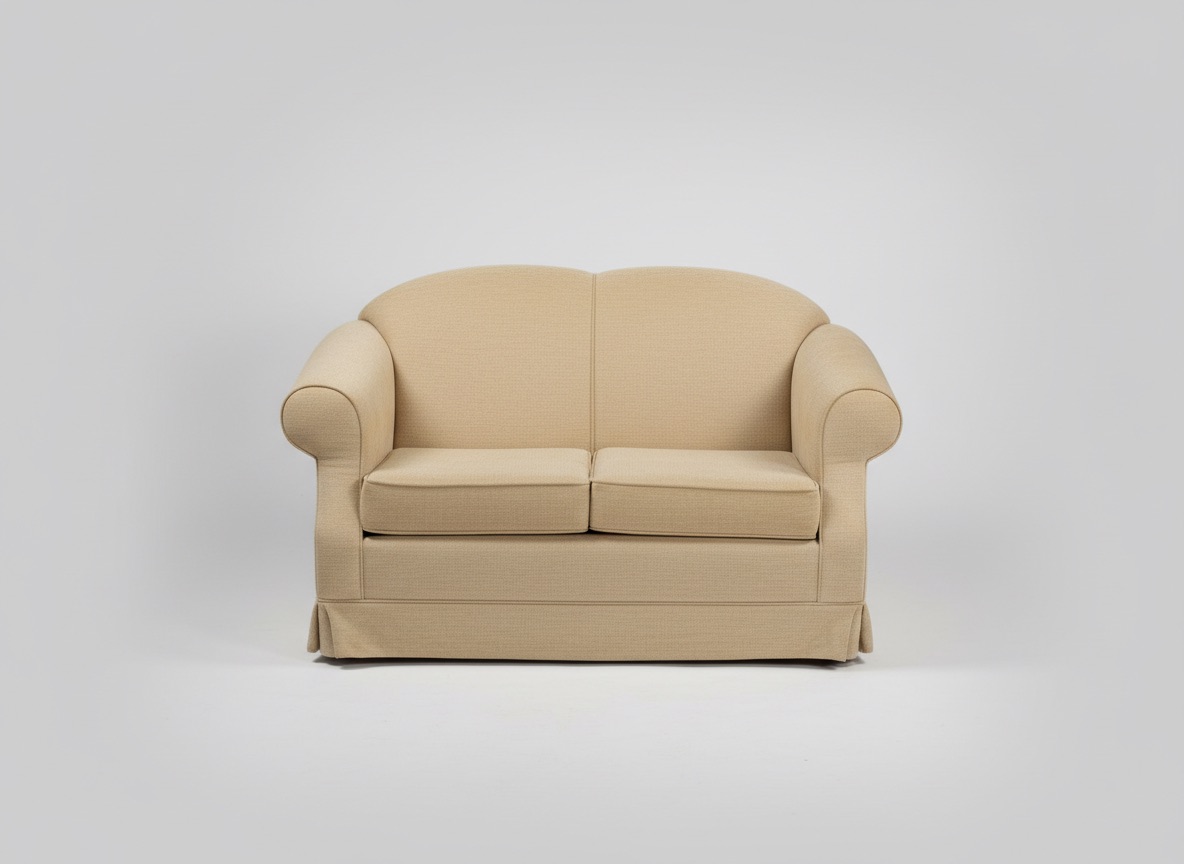 Sofá de dois lugares em tecido bege, com toque macio e estrutura sólida.